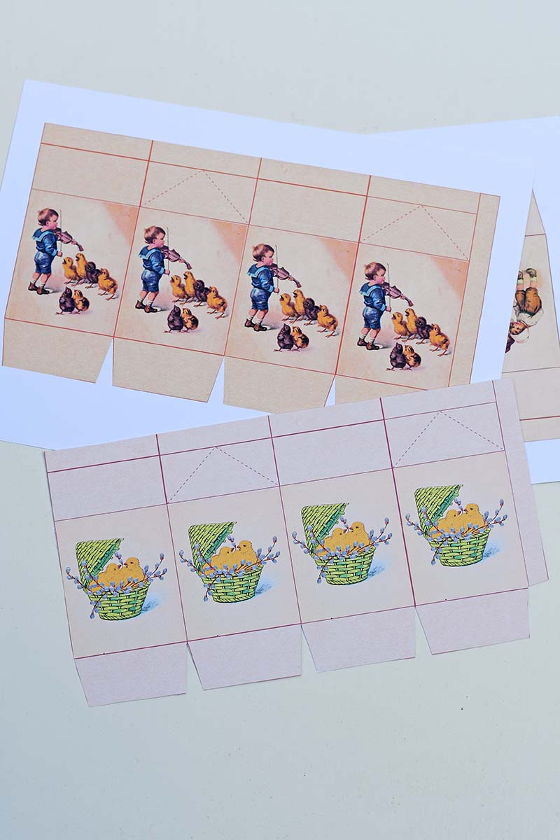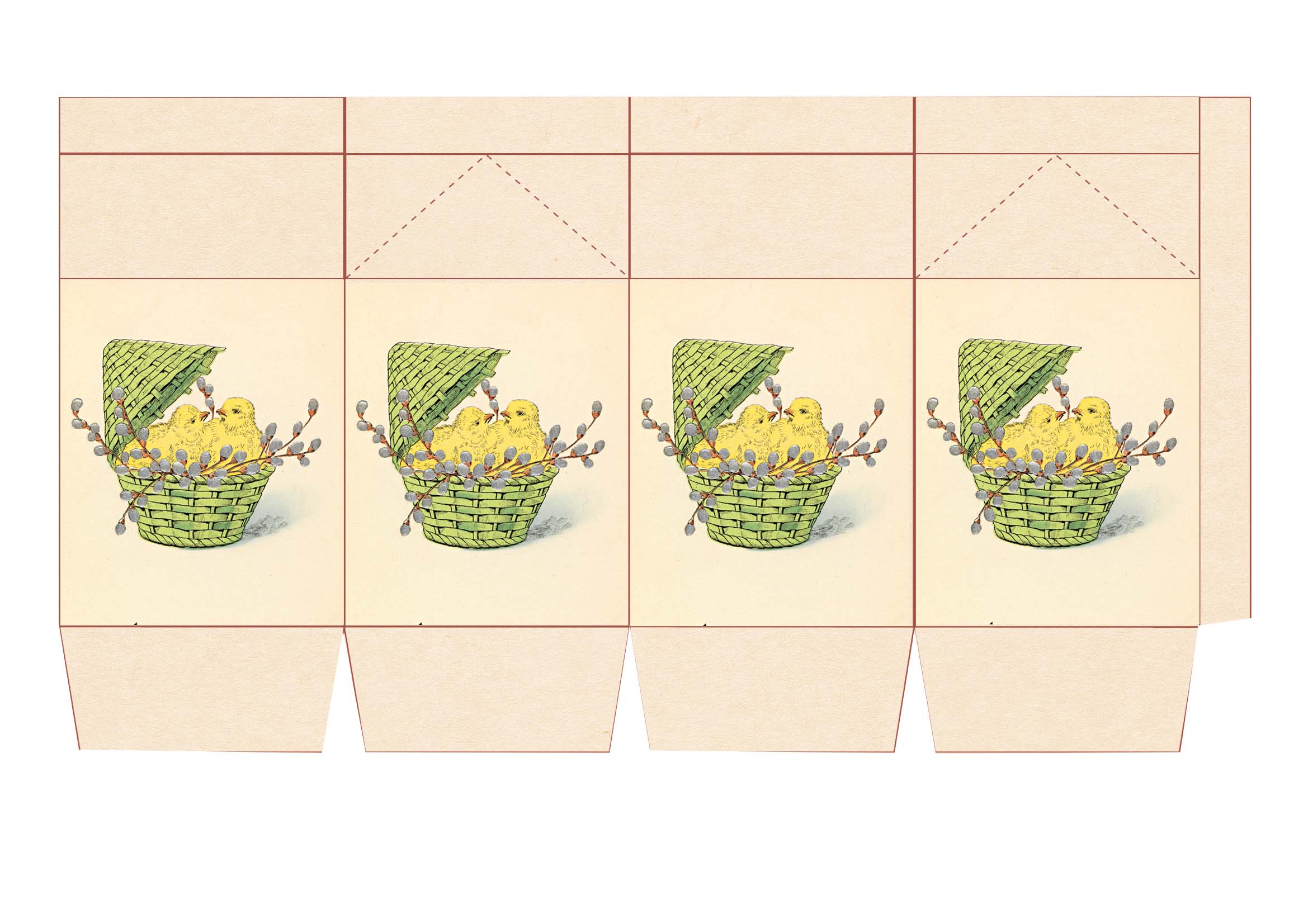 I have translated three vintage Easter postcards above onto a favour box template. You can download them here. You don’t need much in the way of craft supplies for this craft, just paper, scissors and glue.