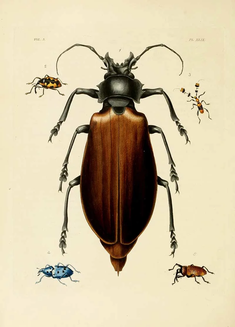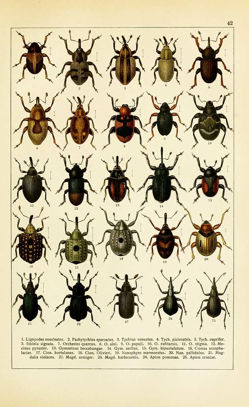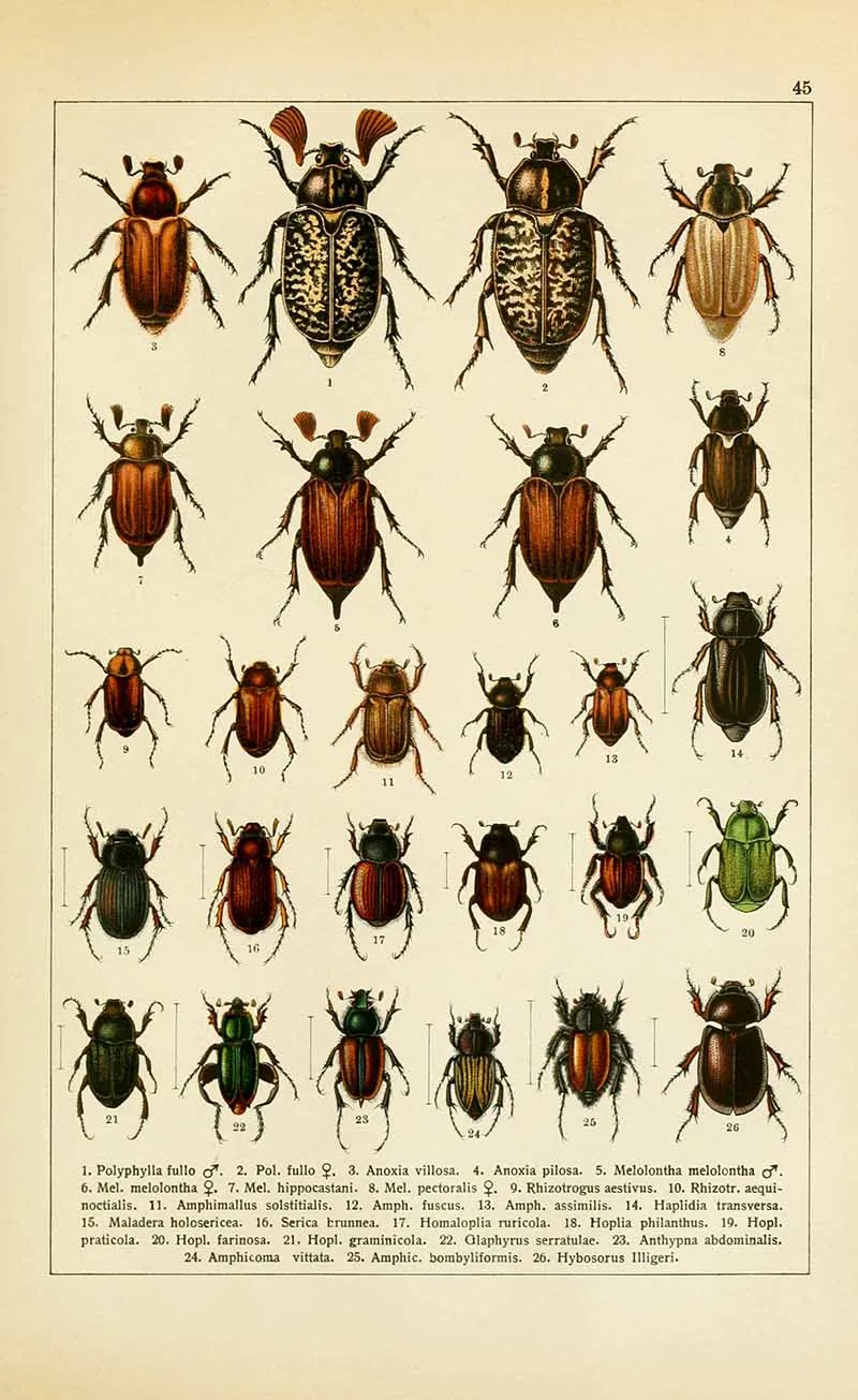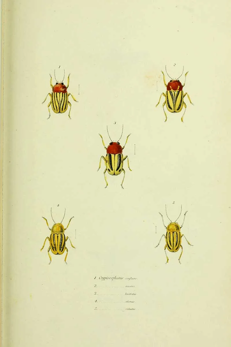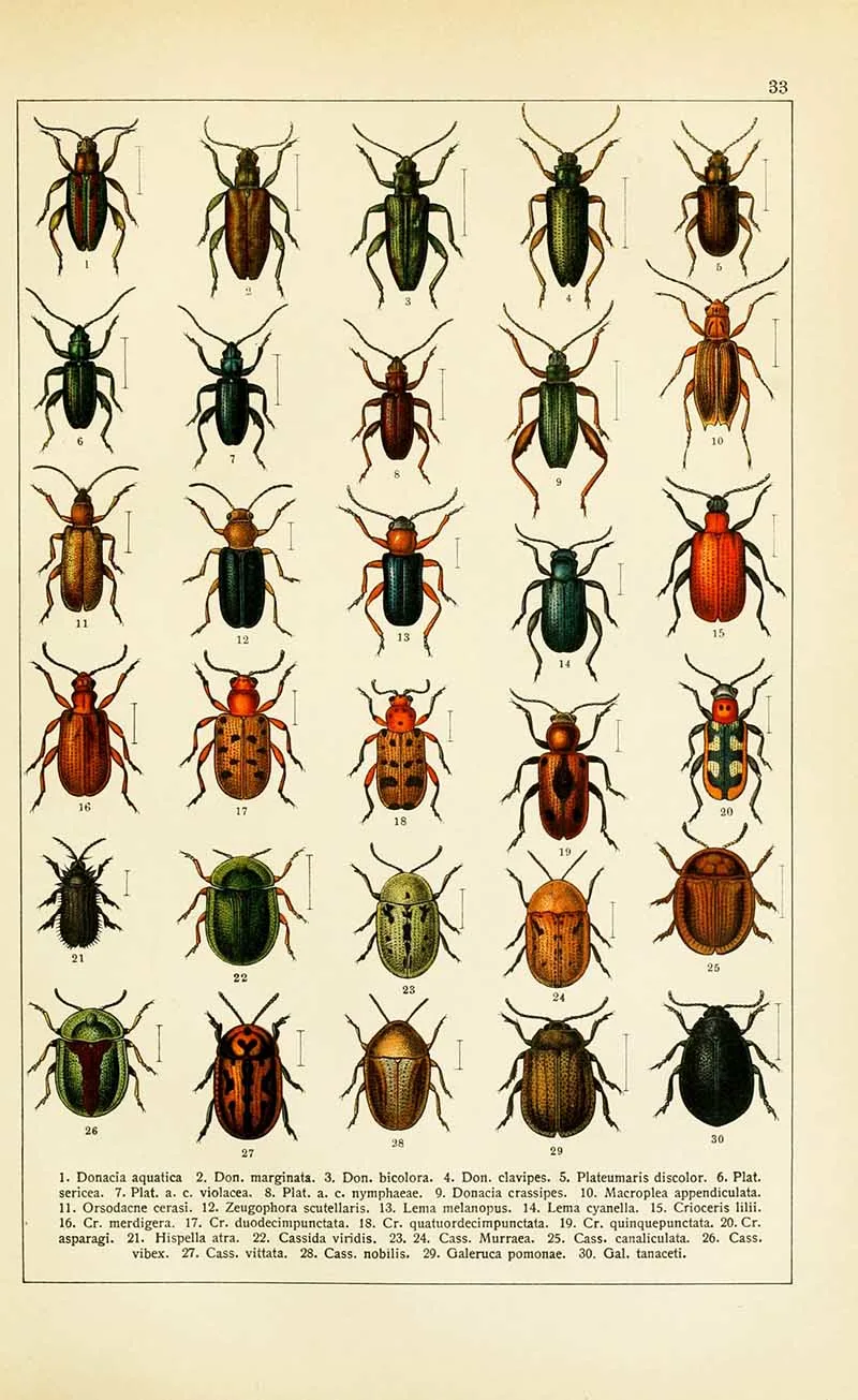 Entomology illustrations of various leaf beetles. They’re plant munchers, with some being notorious agricultural pests. These beetles have cool defence mechanisms, like secreting distasteful chemicals to ward off predators.