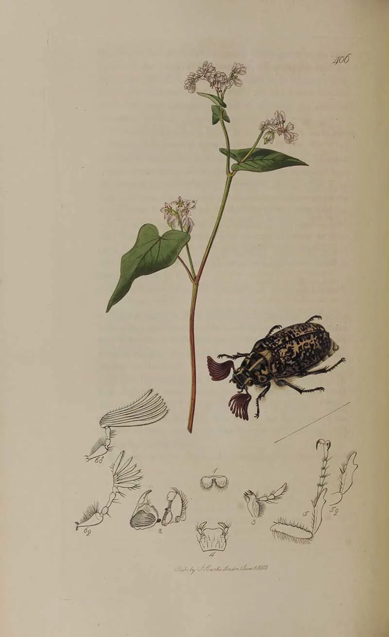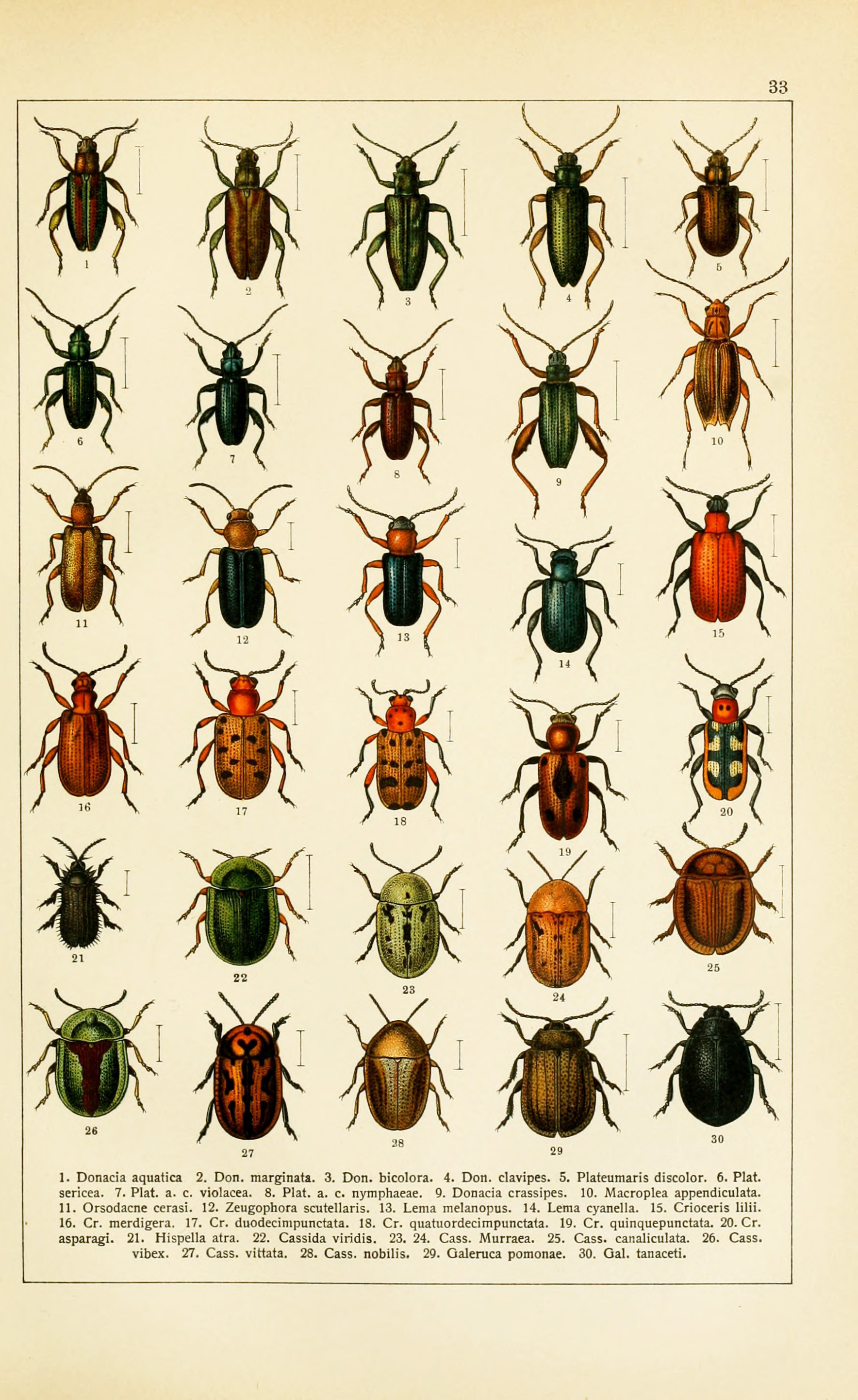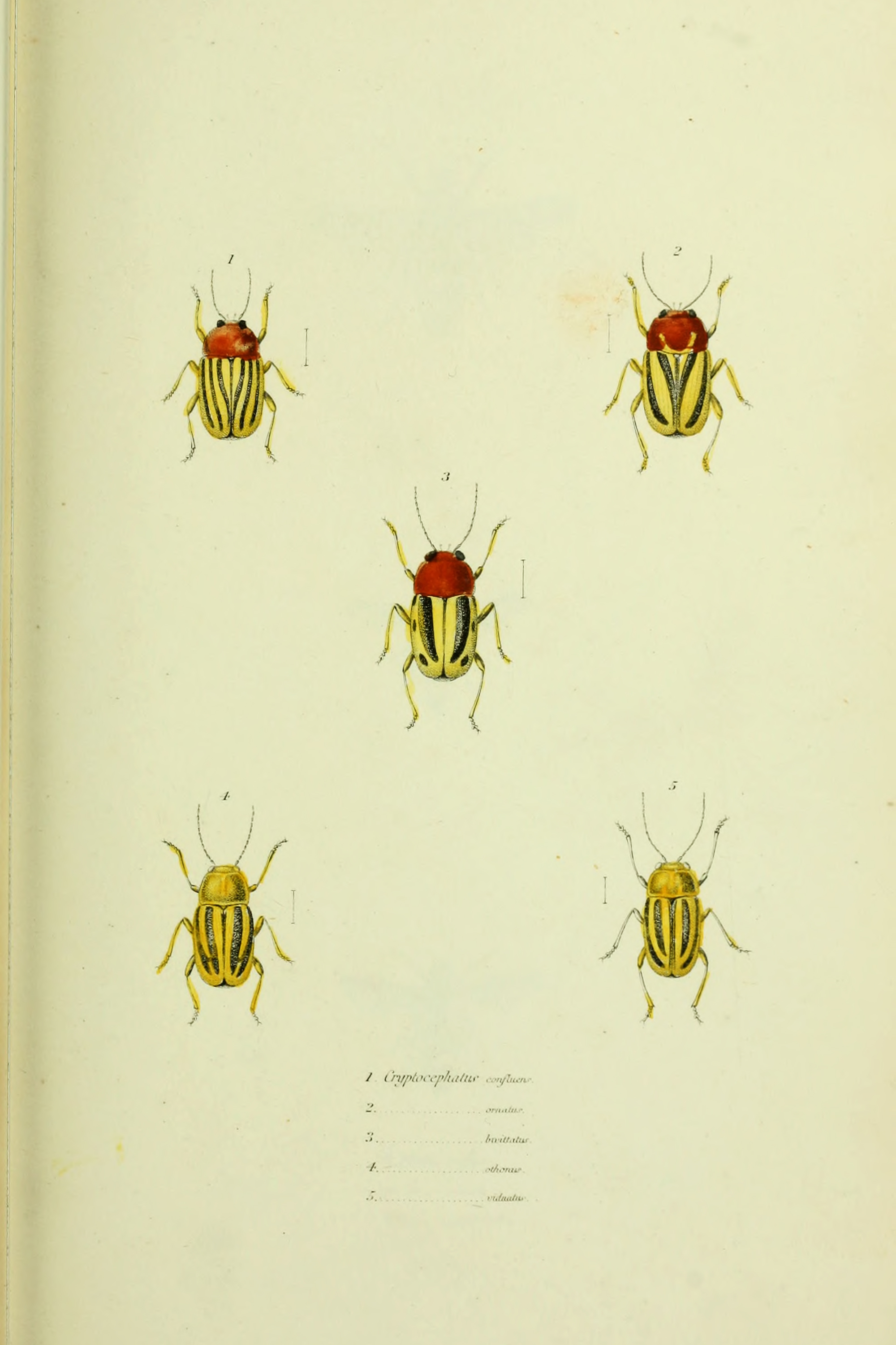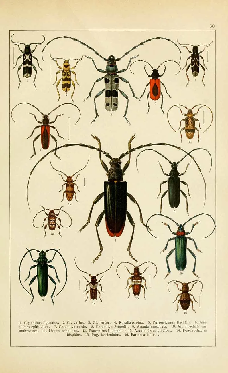 Entomology illustrations of various leaf beetles. They’re plant munchers, with some being notorious agricultural pests. These beetles have cool defence mechanisms, like secreting distasteful chemicals to ward off predators.
