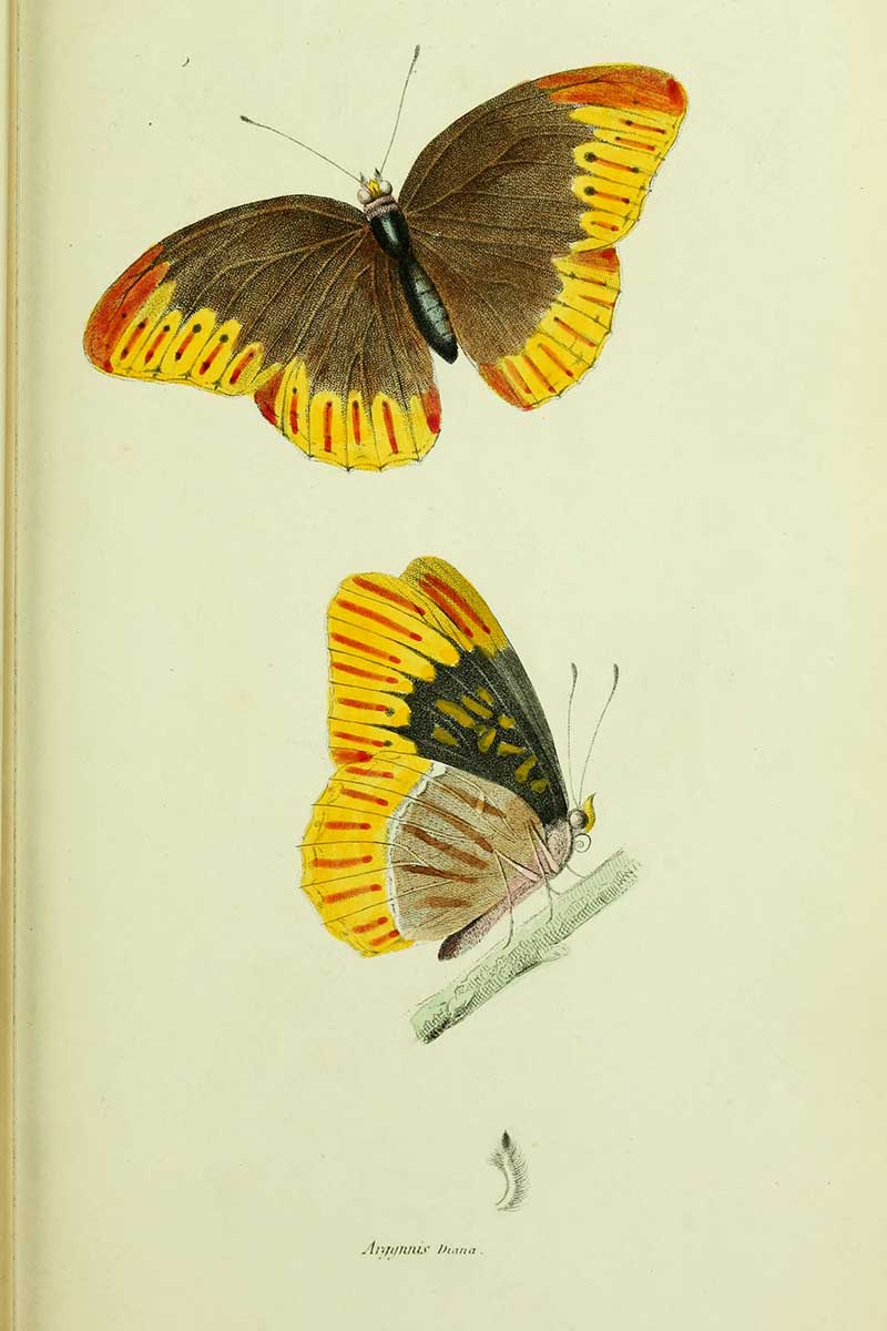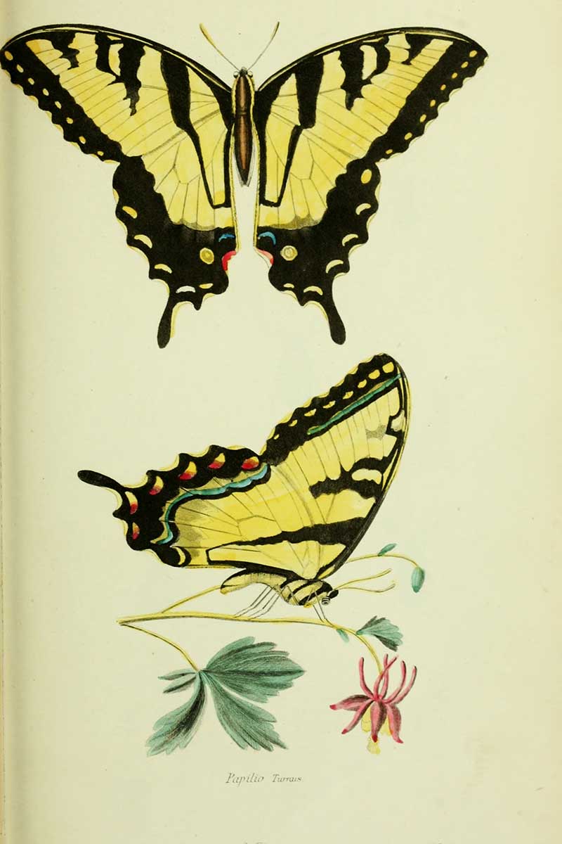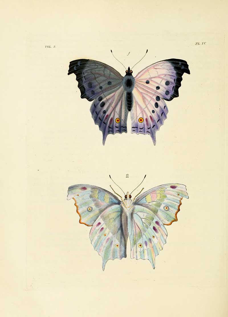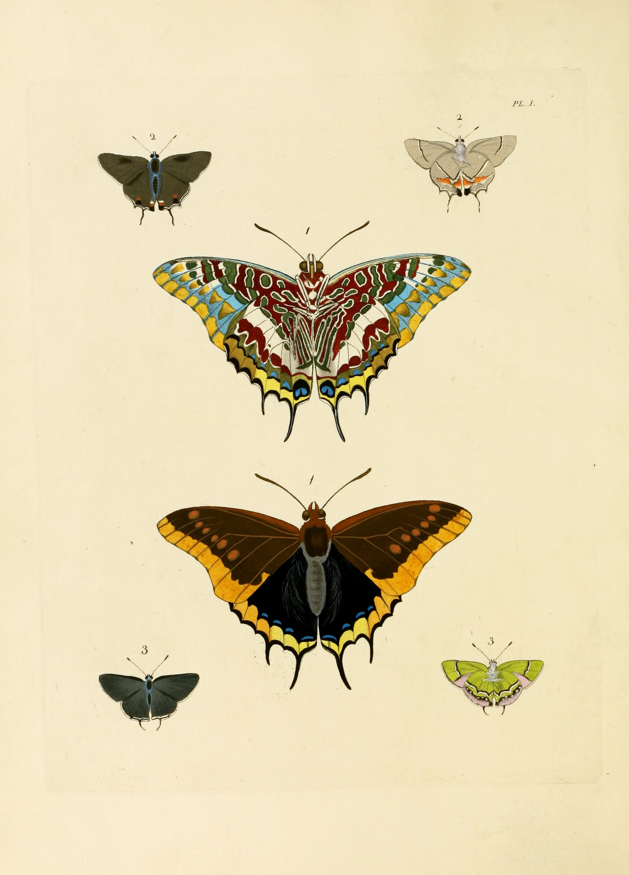 Dru featured many plates of butterflies in his Exotic Entomology book. The beautiful multi-coloured butterfly in the middle is Two Tailed Pasha.