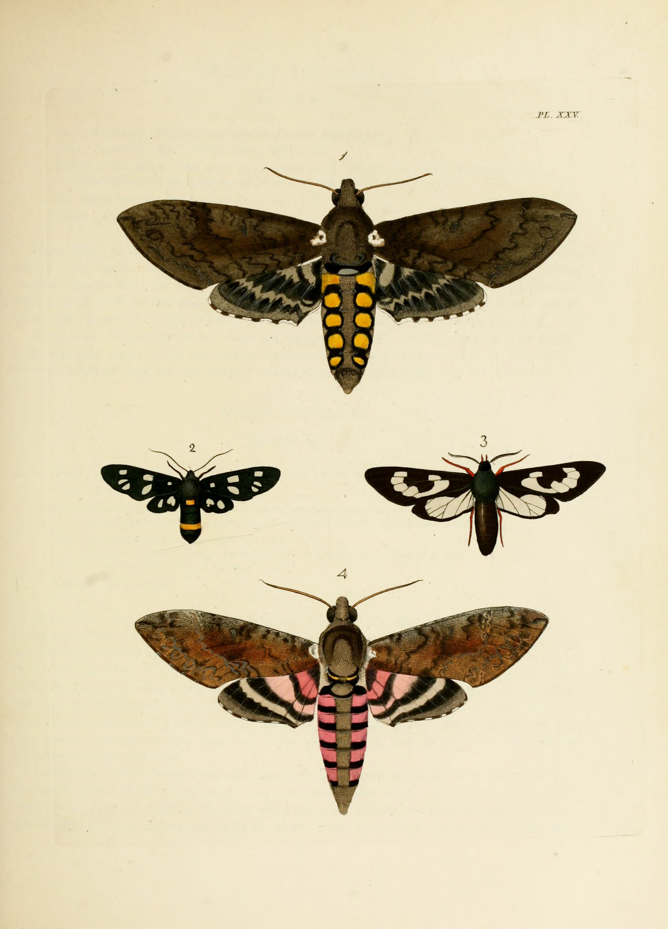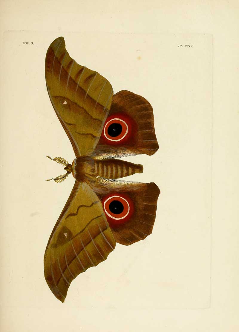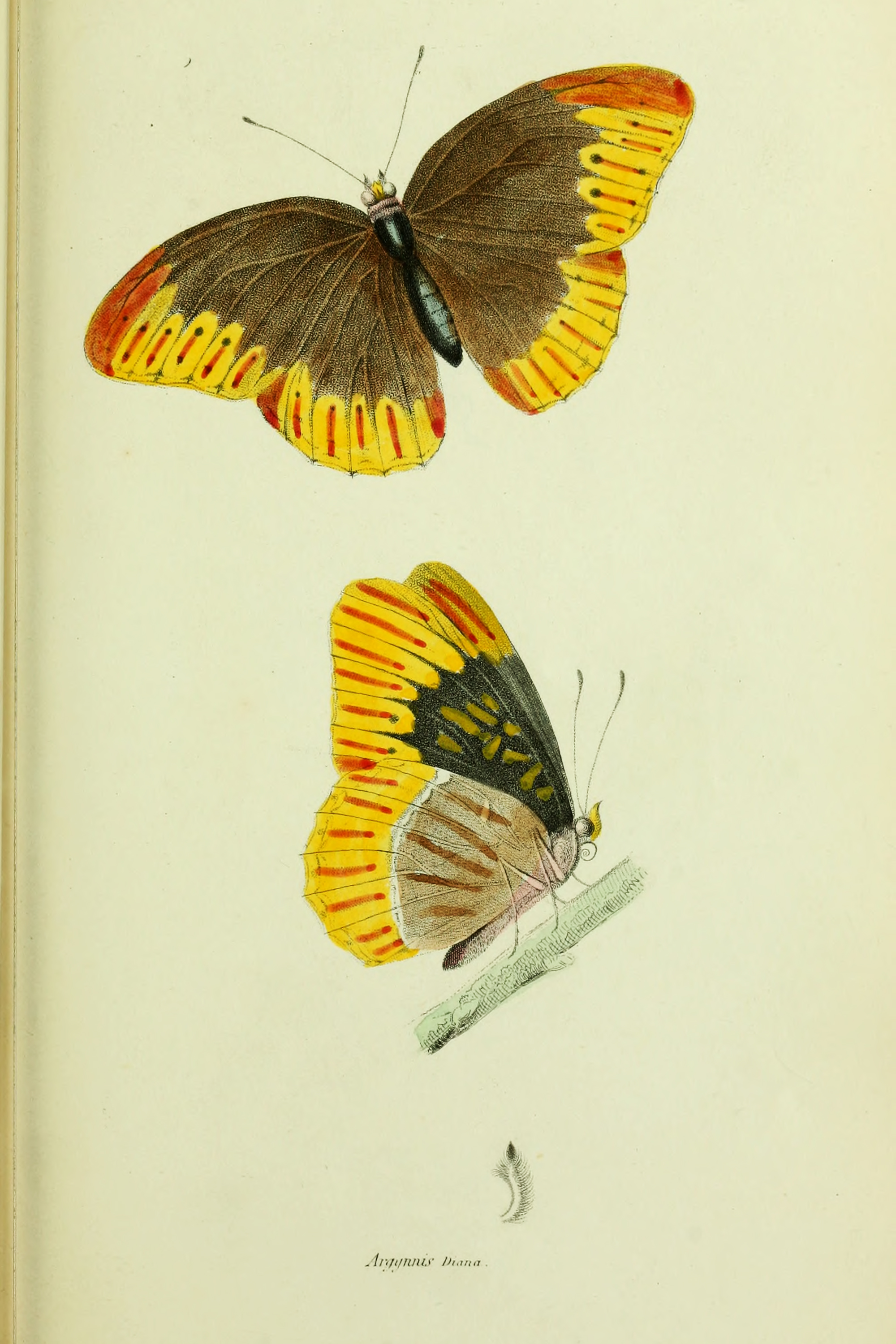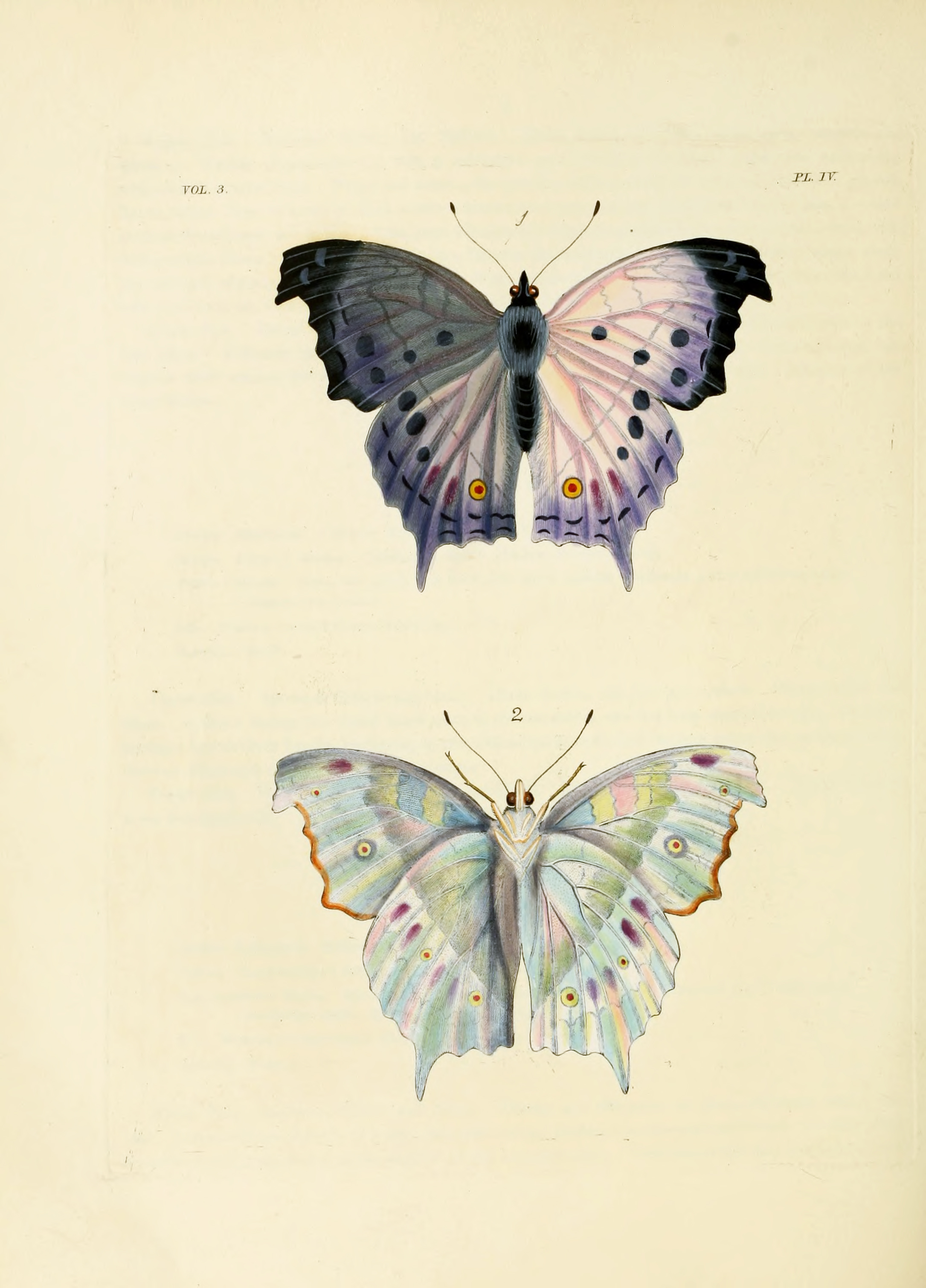 Dru featured many plates of butterflies in his Exotic Entomology book. The beautiful multi-coloured butterfly in the middle is Two Tailed Pasha.