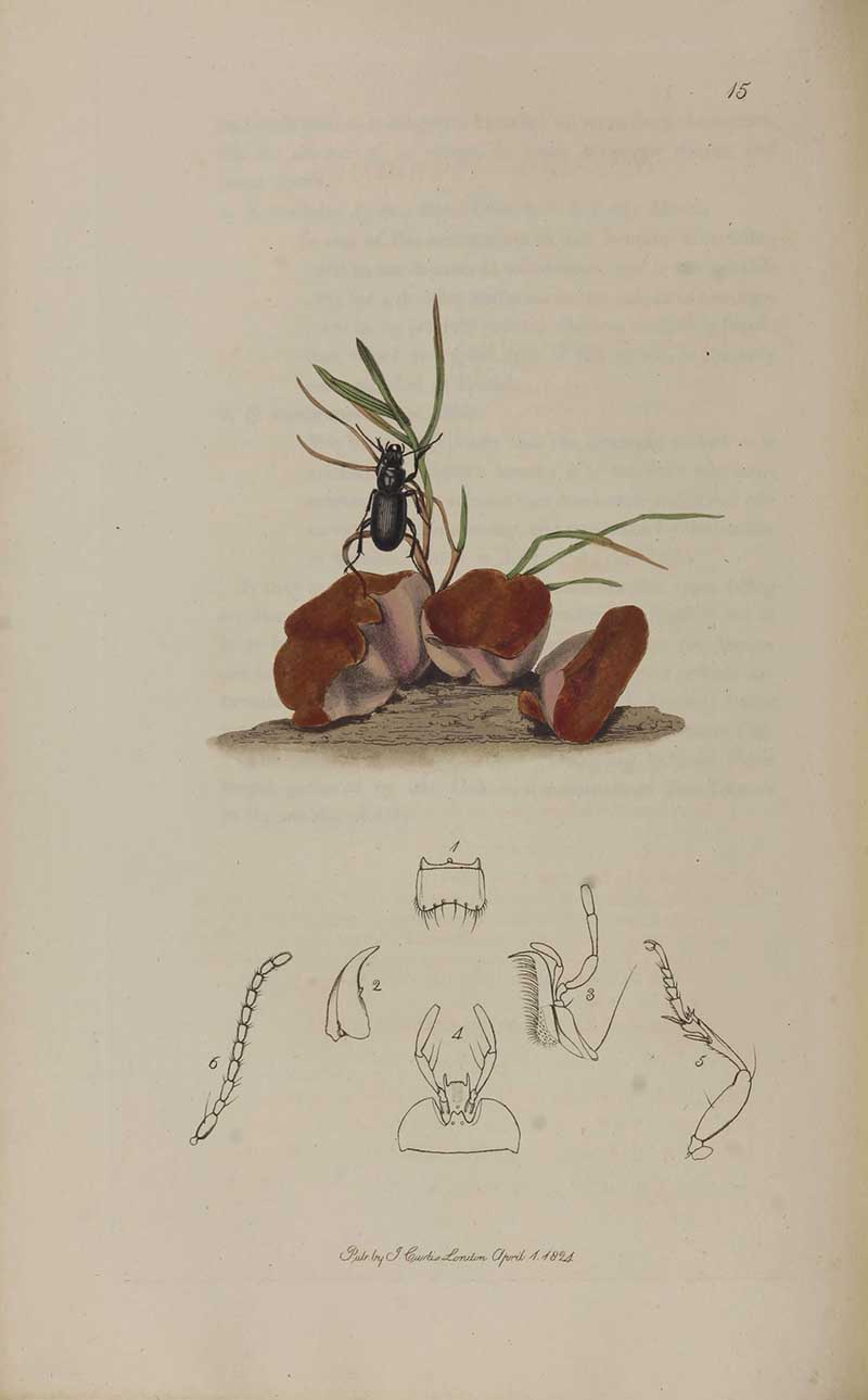 Black ground beetle with orange spread-cup fungi. Check out these James Sowerby fungi drawings.