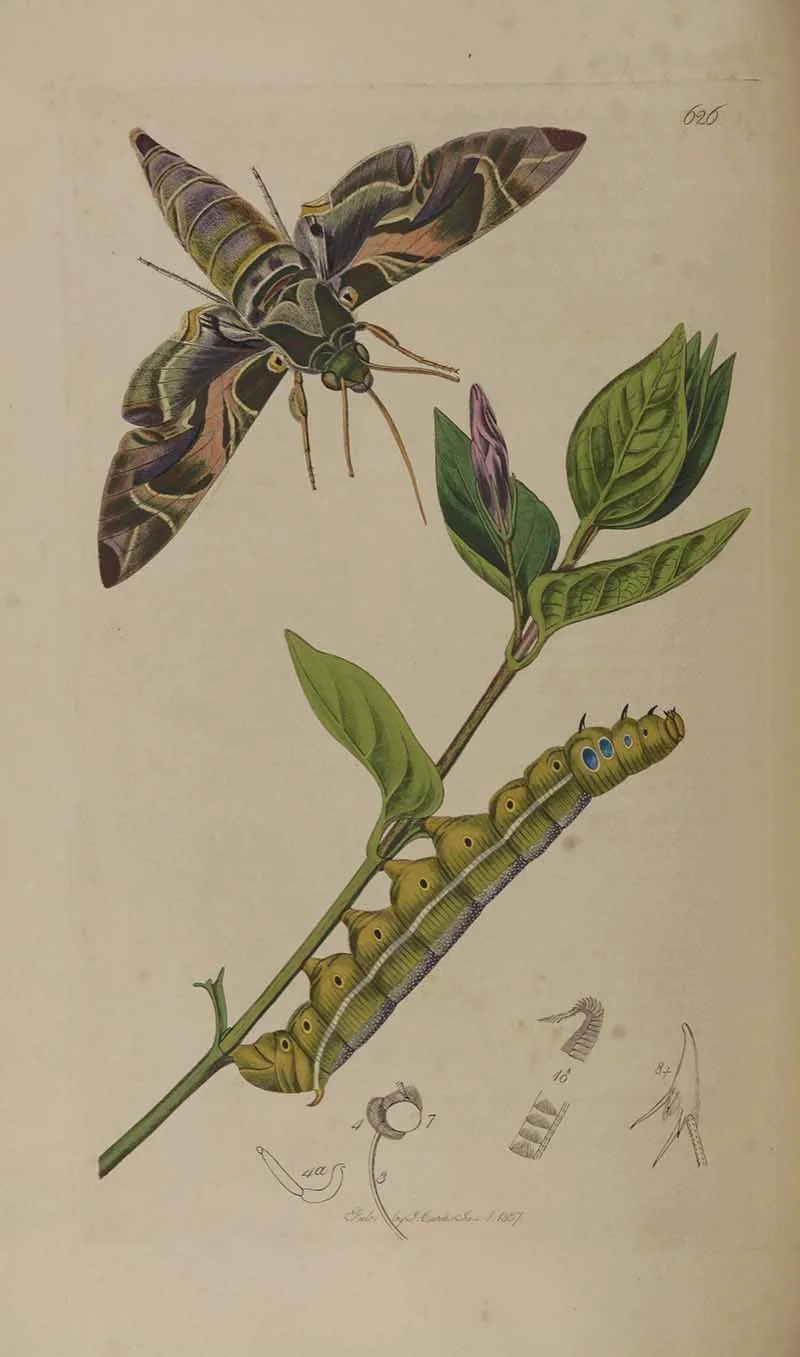 Also known as oleander hawk-moth, the illustration shows the caterpillar on a pea plant.