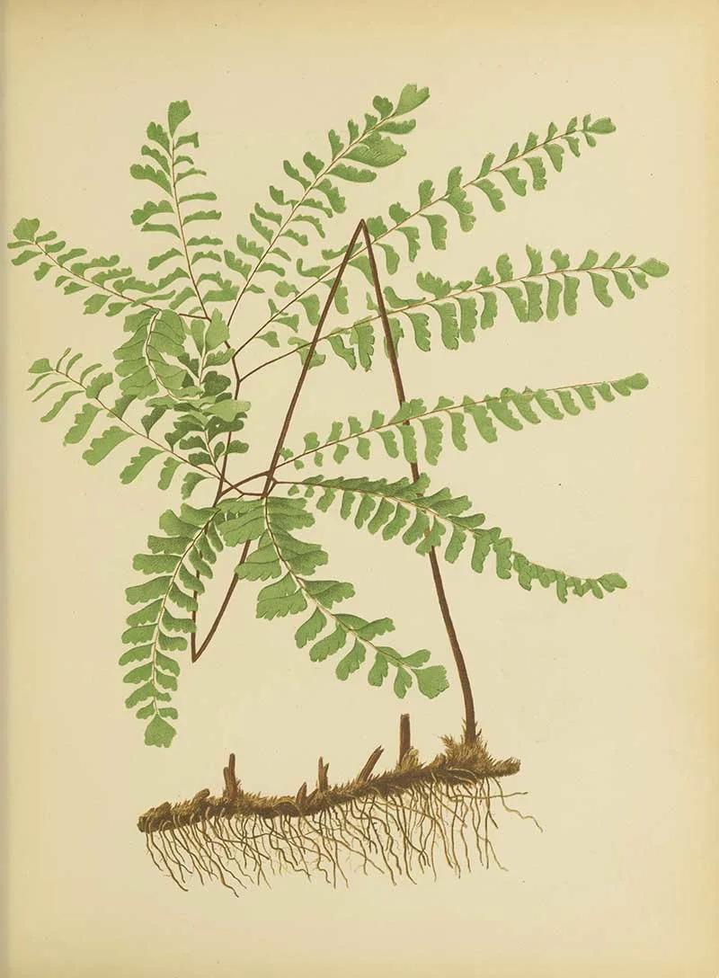 Watercolour fern illustration of an American Maidenhair. This fern has the common name of “Five-Fingered Fern” and comes from the plant’s distinctive appearance. Its fronds branch out in a way reminiscent of a hand’s fingers extending from a palm. This branching is unusual among ferns, adding to the plant’s distinctive charm.