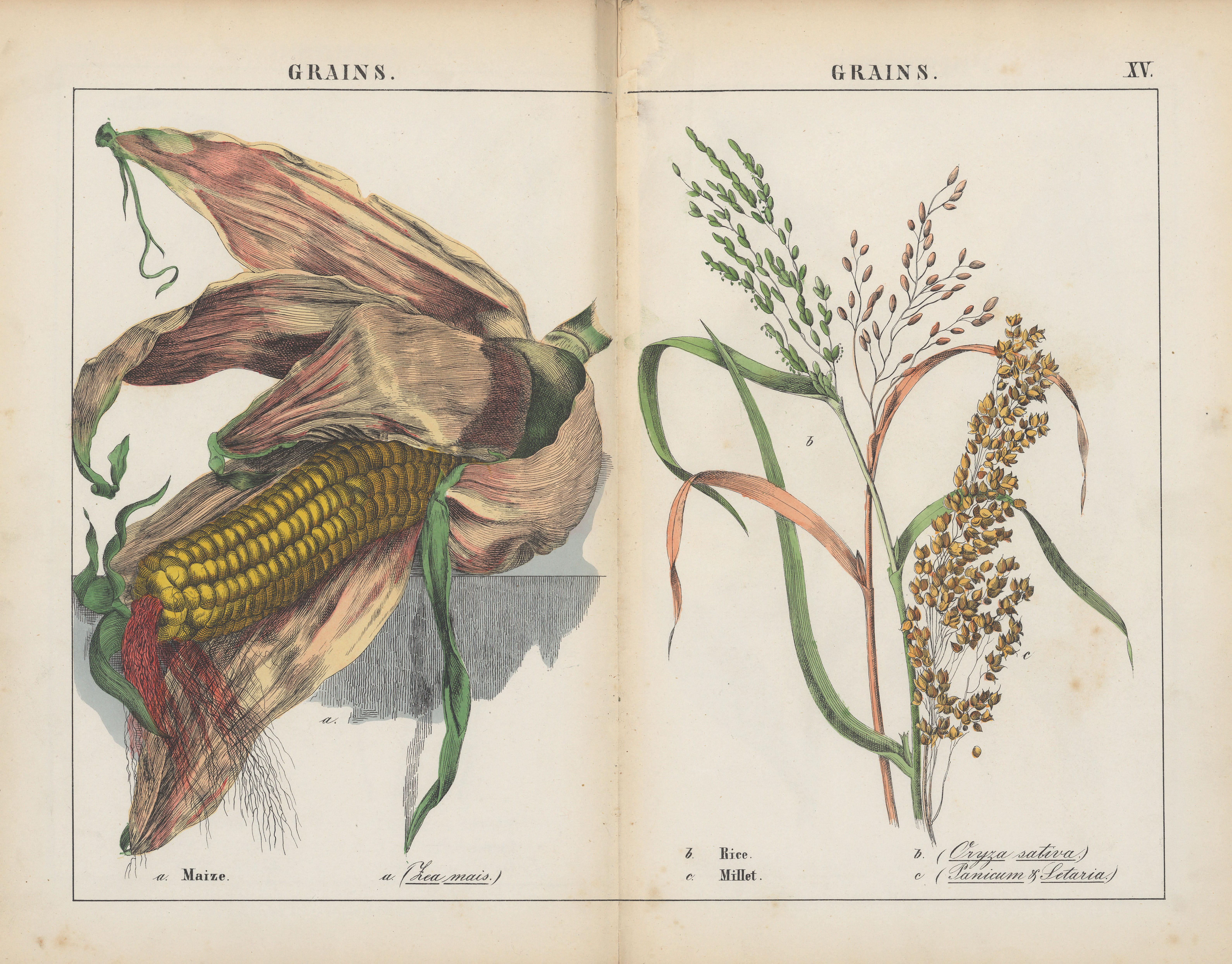 “The MAIZE is the largest and handsomest of all the grains. The plant is sometimes six or eight feet high, with immense flag-like leaves, tinted with a ruddy colour.“