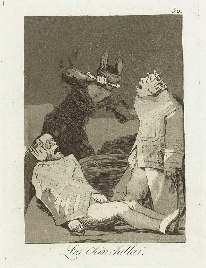 This is an etching from his series “Los Caprichos,” a set of 80 prints created by Goya in 1797 and 1798. The prints showcase a range of themes, including the Spanish society of his time, the corruption of the Church, and superstitions.
