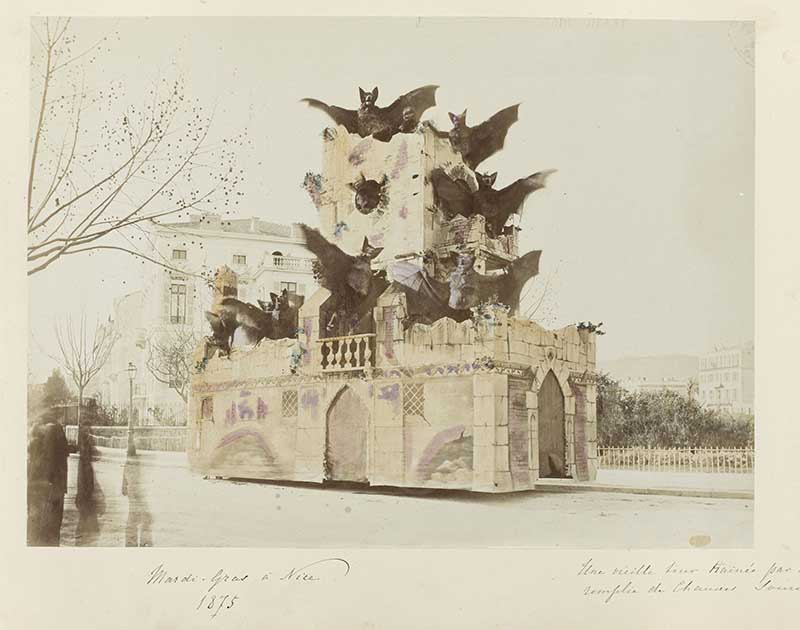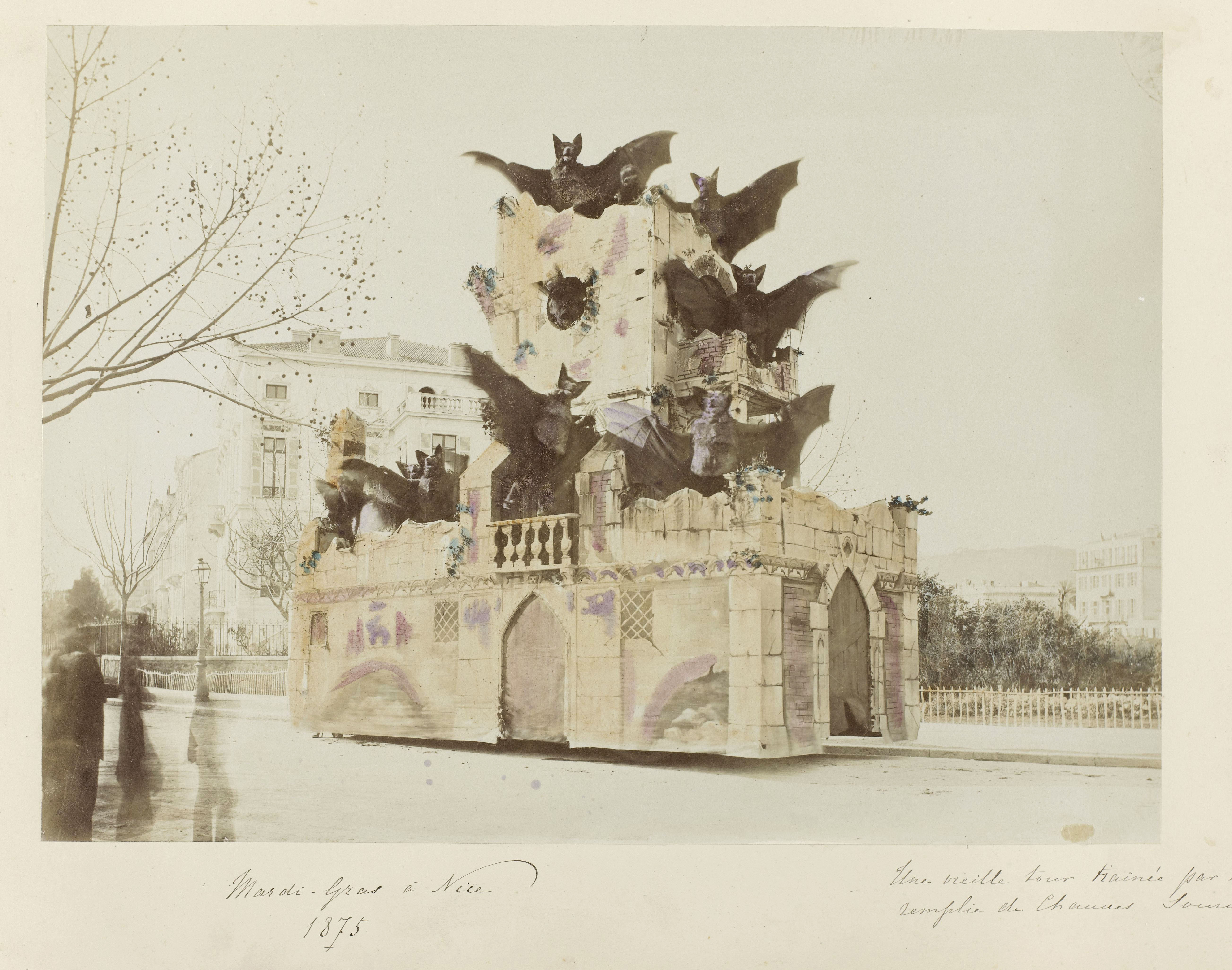 Float with tower and bats during Mardi Gras in Nice, anonymous, 1875.