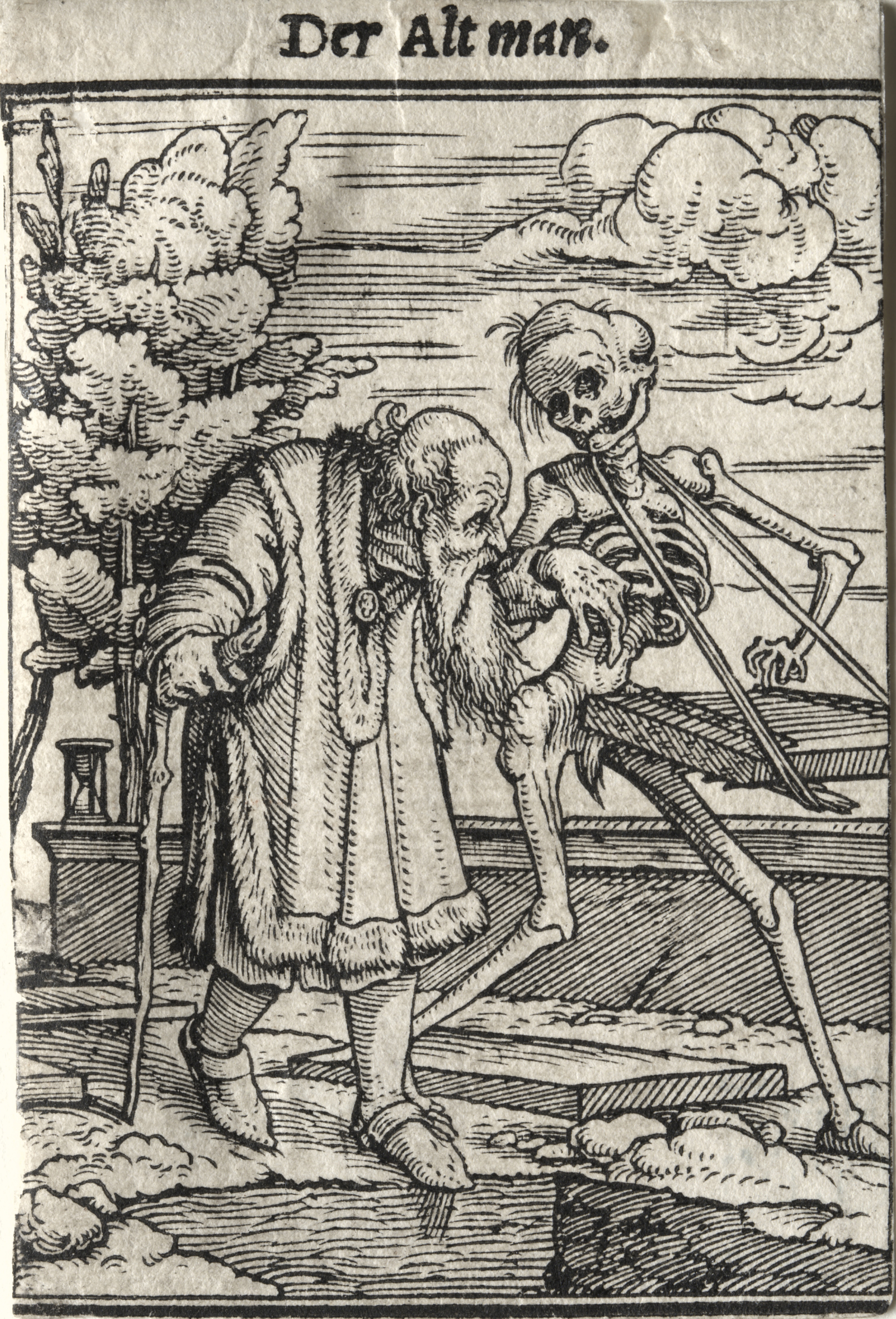 The artwork features an old, winged woman representing time or old age, holding a timekeeping device and walking forward.