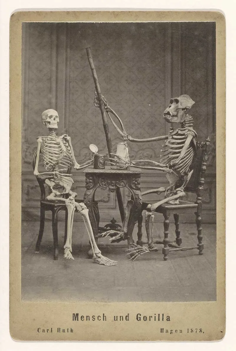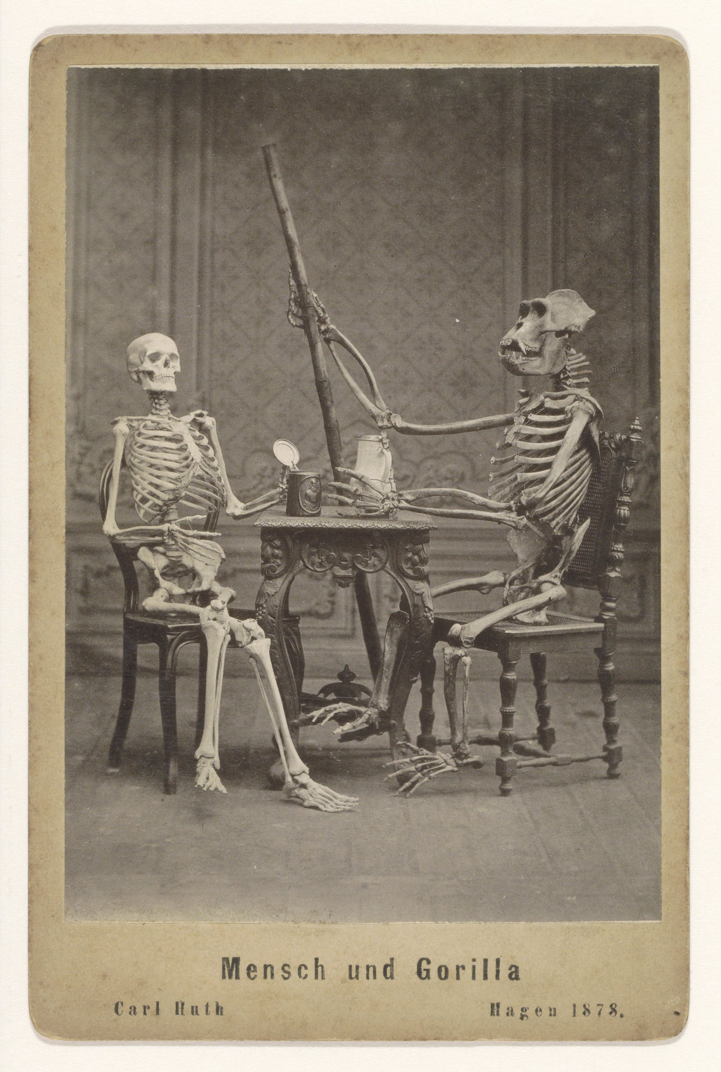 Staging of human and gorilla skeletons at the table, Carl Huth, 1878