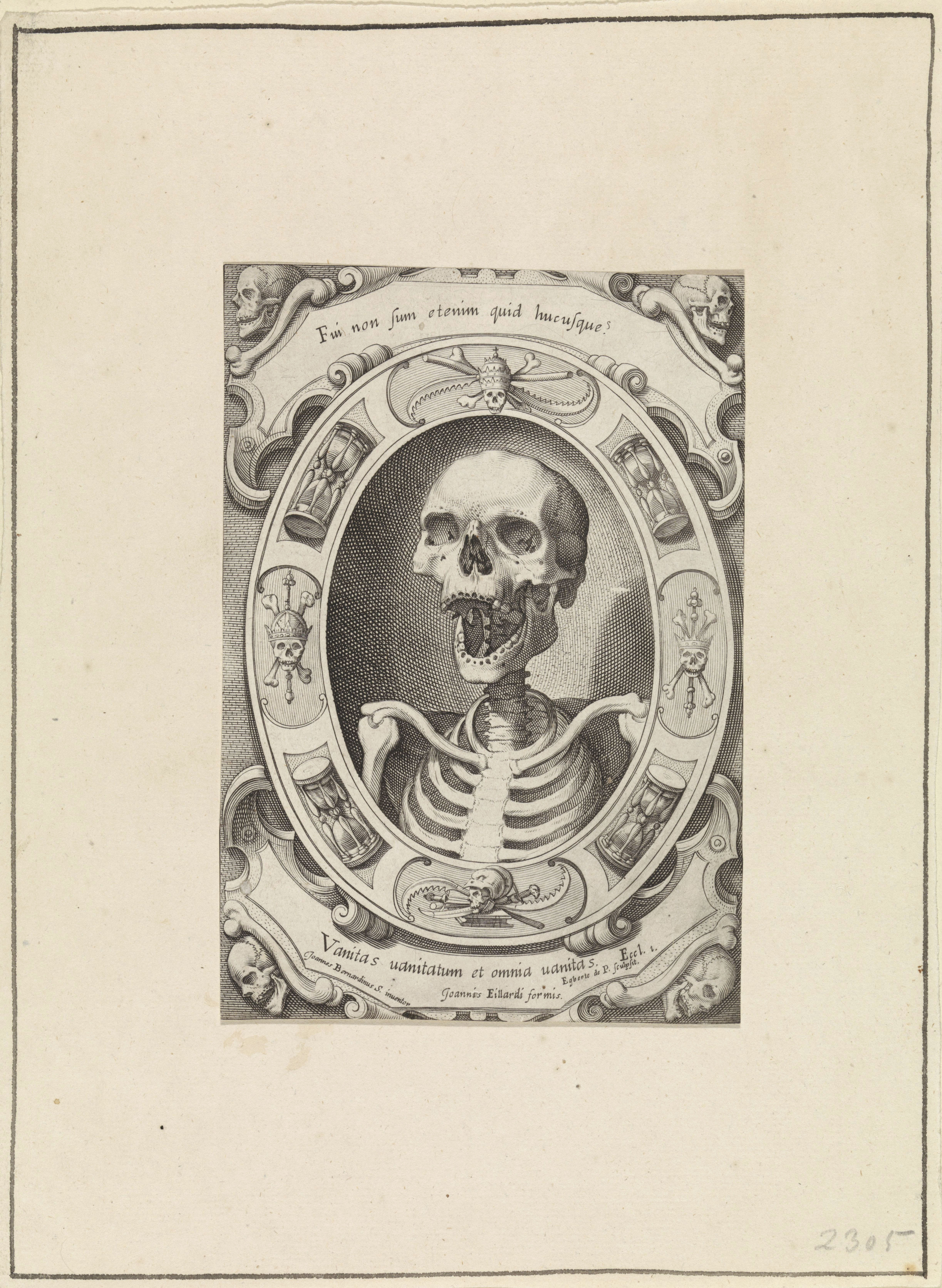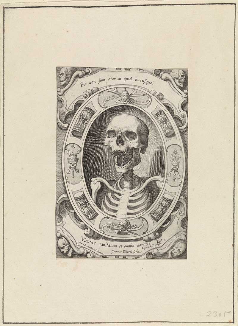 Vintage Halloween drawing of a toothless skeleton bust, Egbert van Panderen, after Joannes Bernardinus S., c. 1590 – 1637.