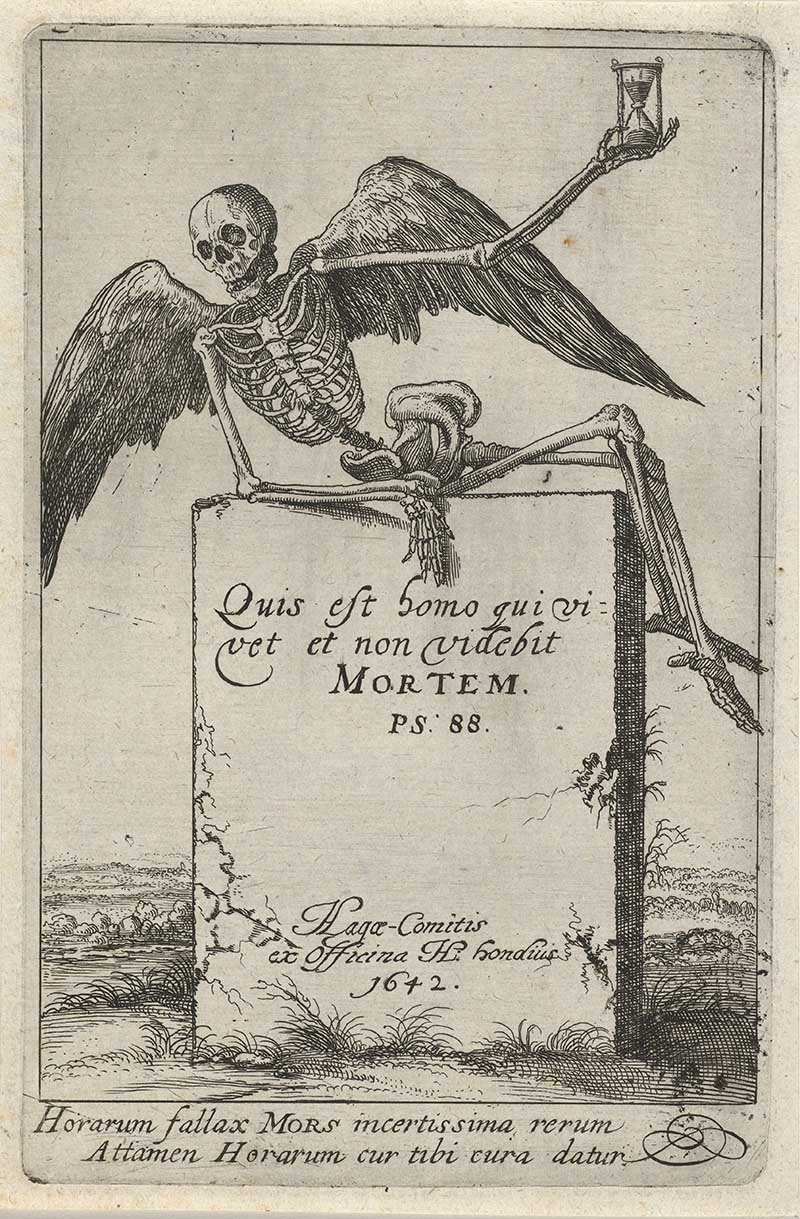 Winged skeleton with hourglass on a gravestone, Teodoro Filippo di Liagno, 1642.