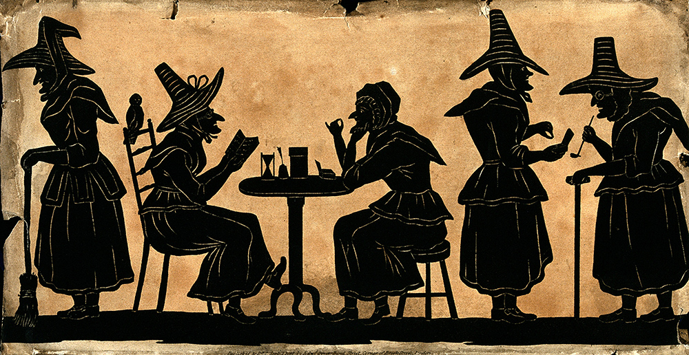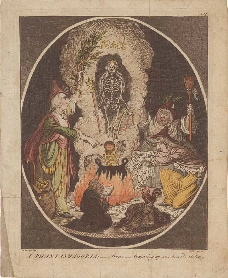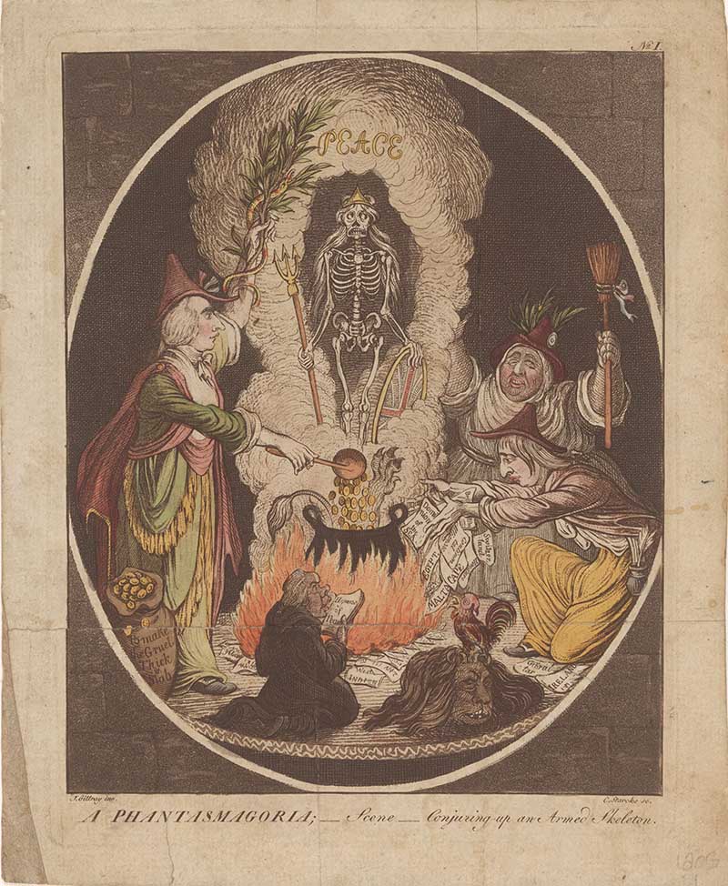 This satirical cartoon on the Peace of Amiens, 1802, C. Starcke, after James Gillray. But it has a very Halloween vibe, with the Witches having a Halloween party around a bubbling cauldron.