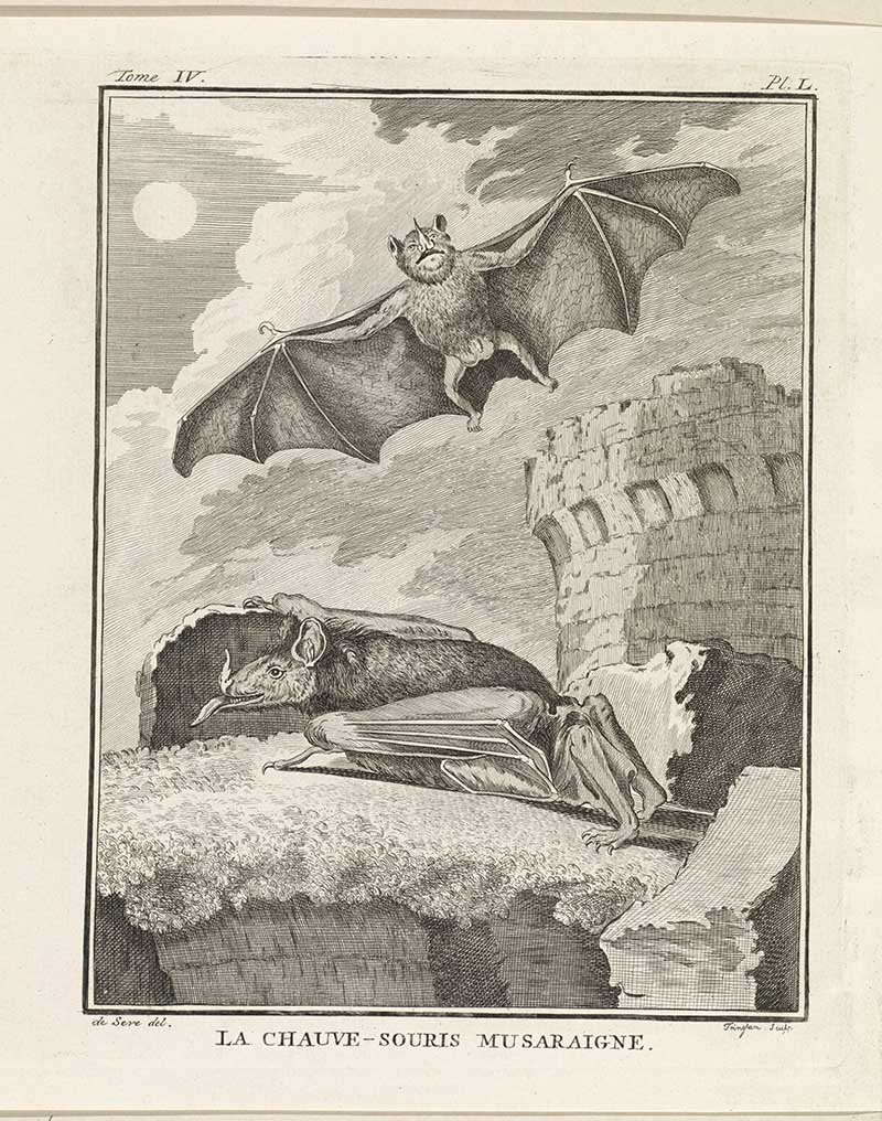 Spooky bat and tower illustration by Jacques de Sève, 1773.