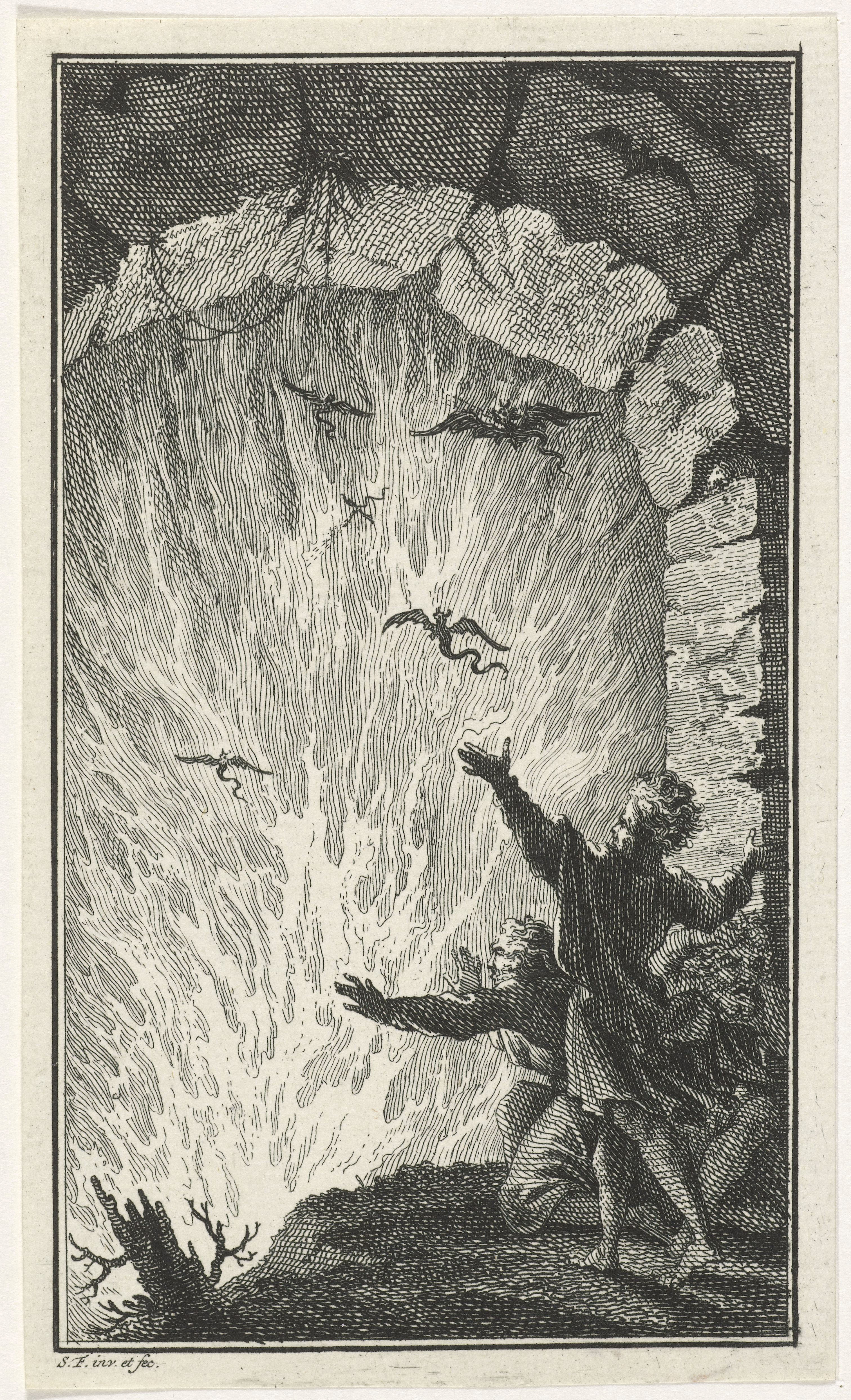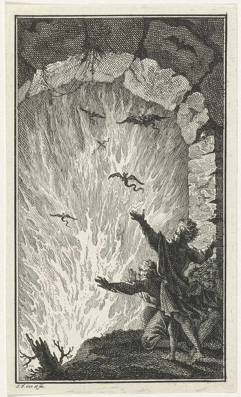 “Figuren voor de hellepoort,” by Dutch artist Simon Fokke (1712-1784), translates to “Figures at the Gates of Hell.” Likely depicting a detailed and allegorical scene at hell’s entrance.