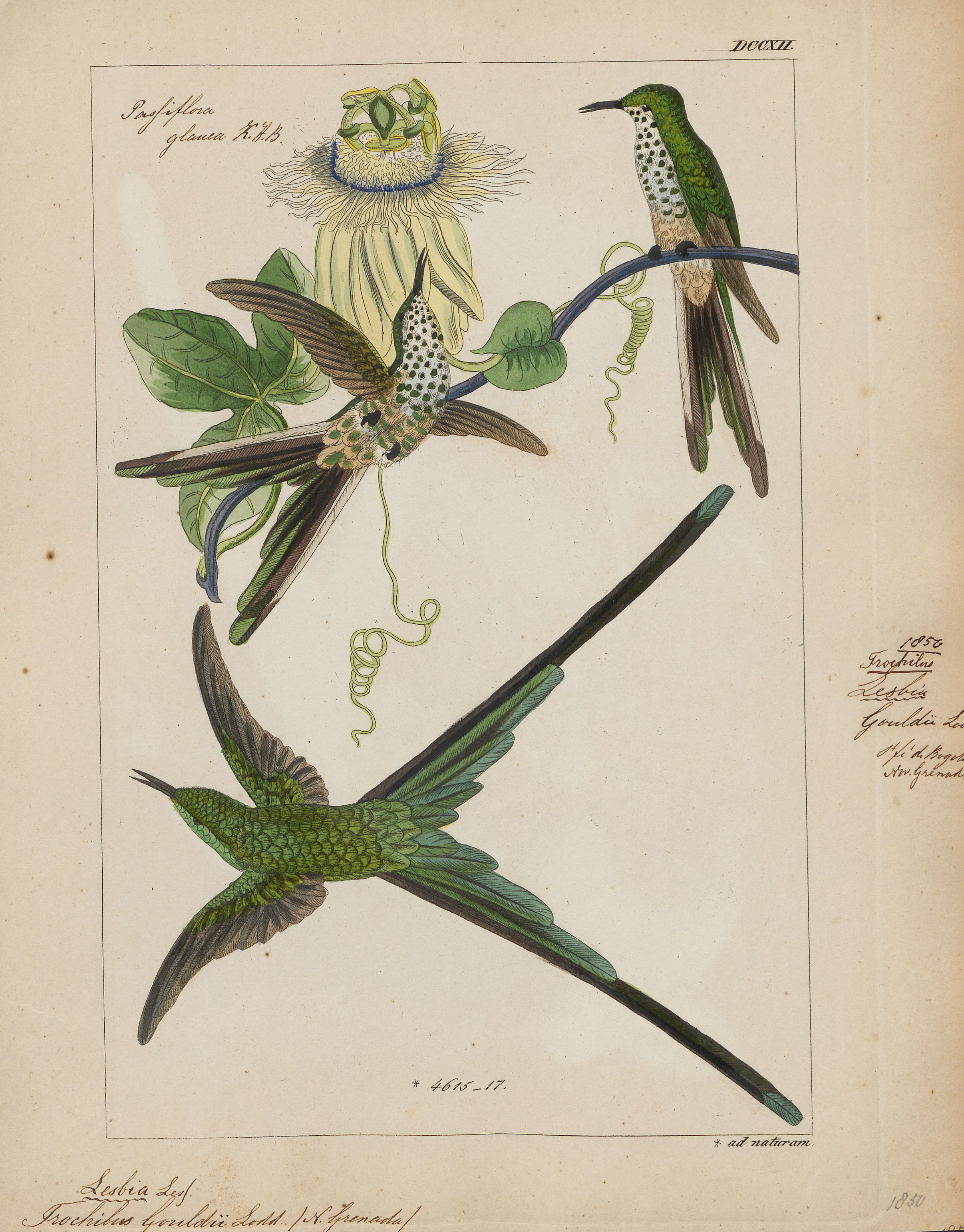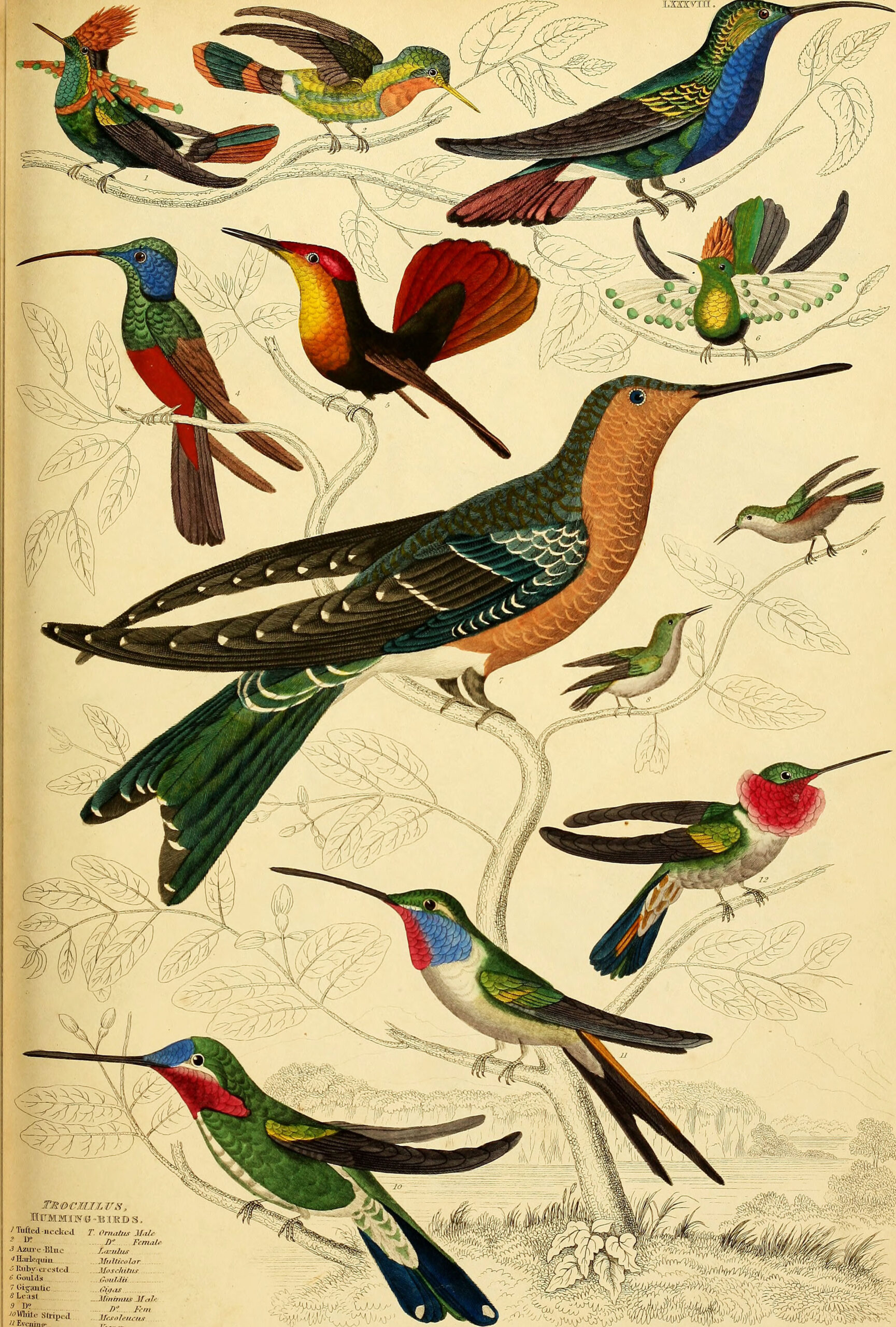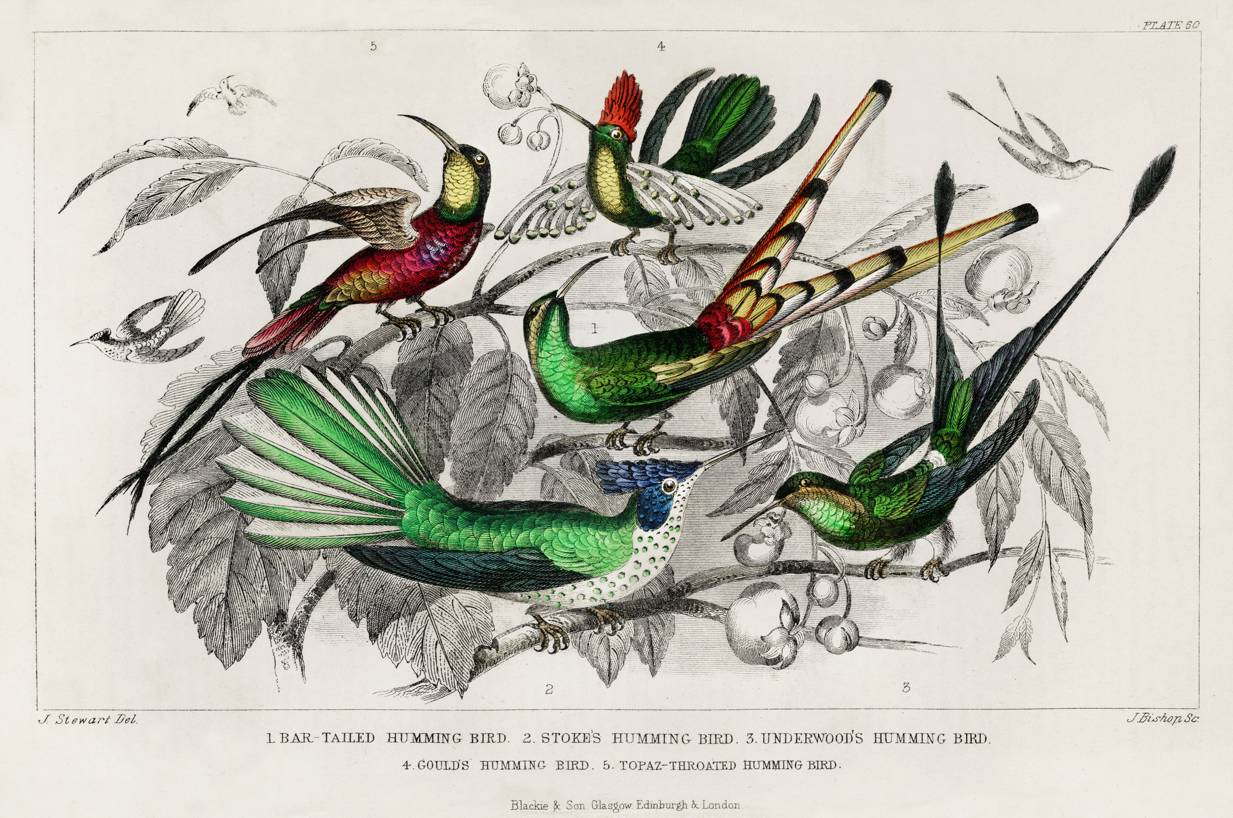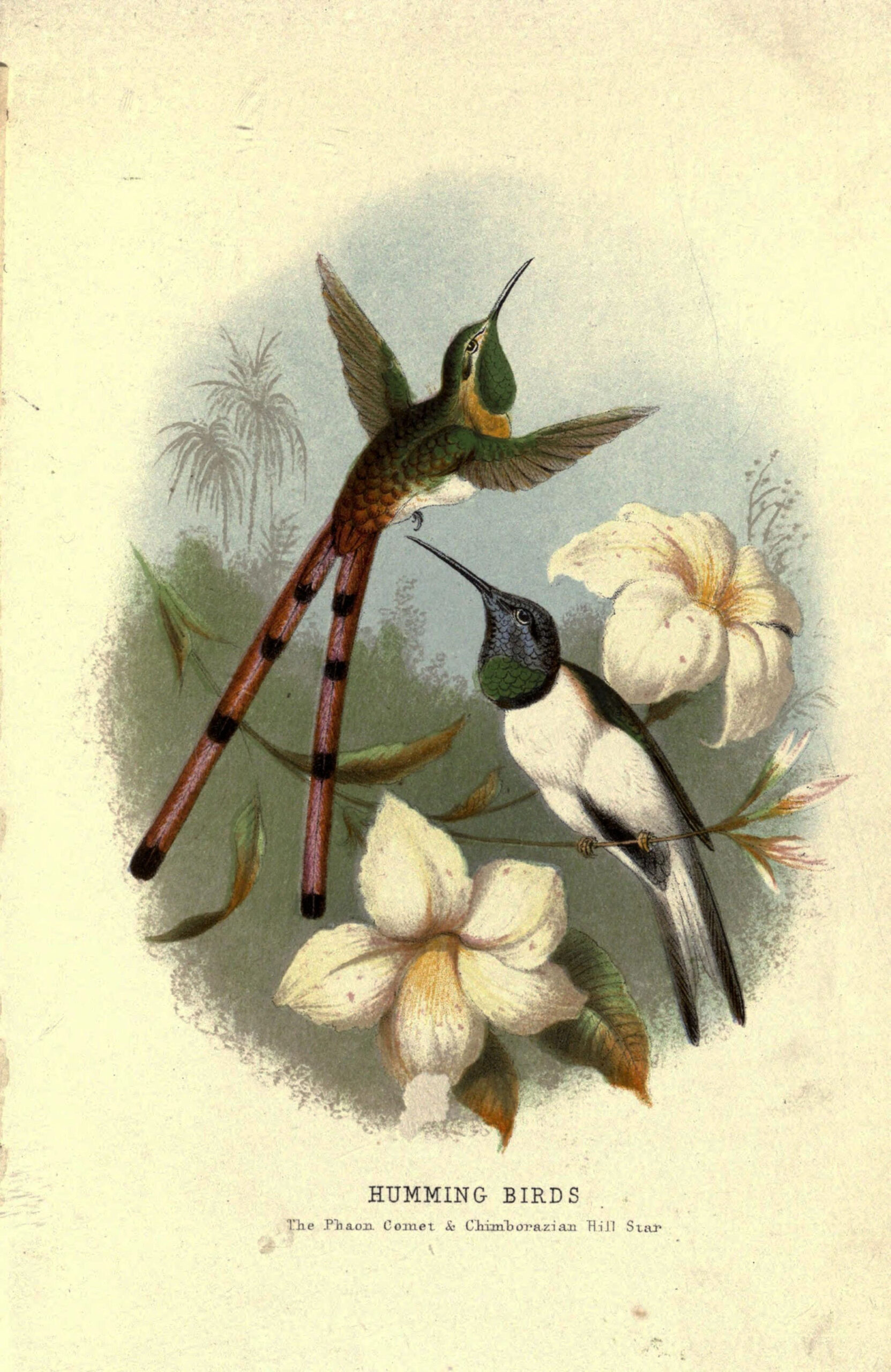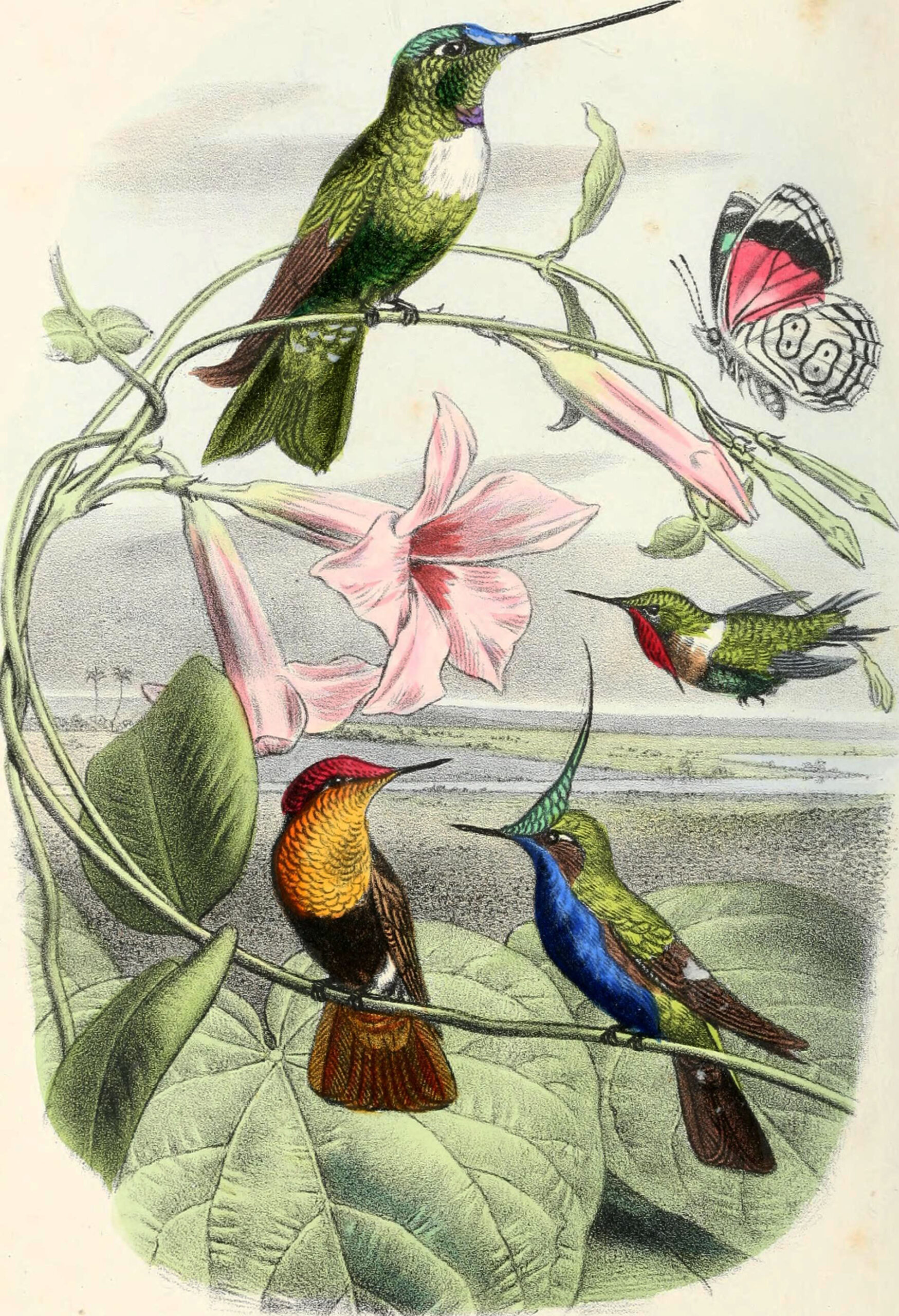 Hummingbirds in the illustration: Bar-Tailed Humming Bird, Stoke Humming Bird, Underwood’s Humming Bird, Gould’s Humming Bird, and Topaz Throated Humming Bird.
