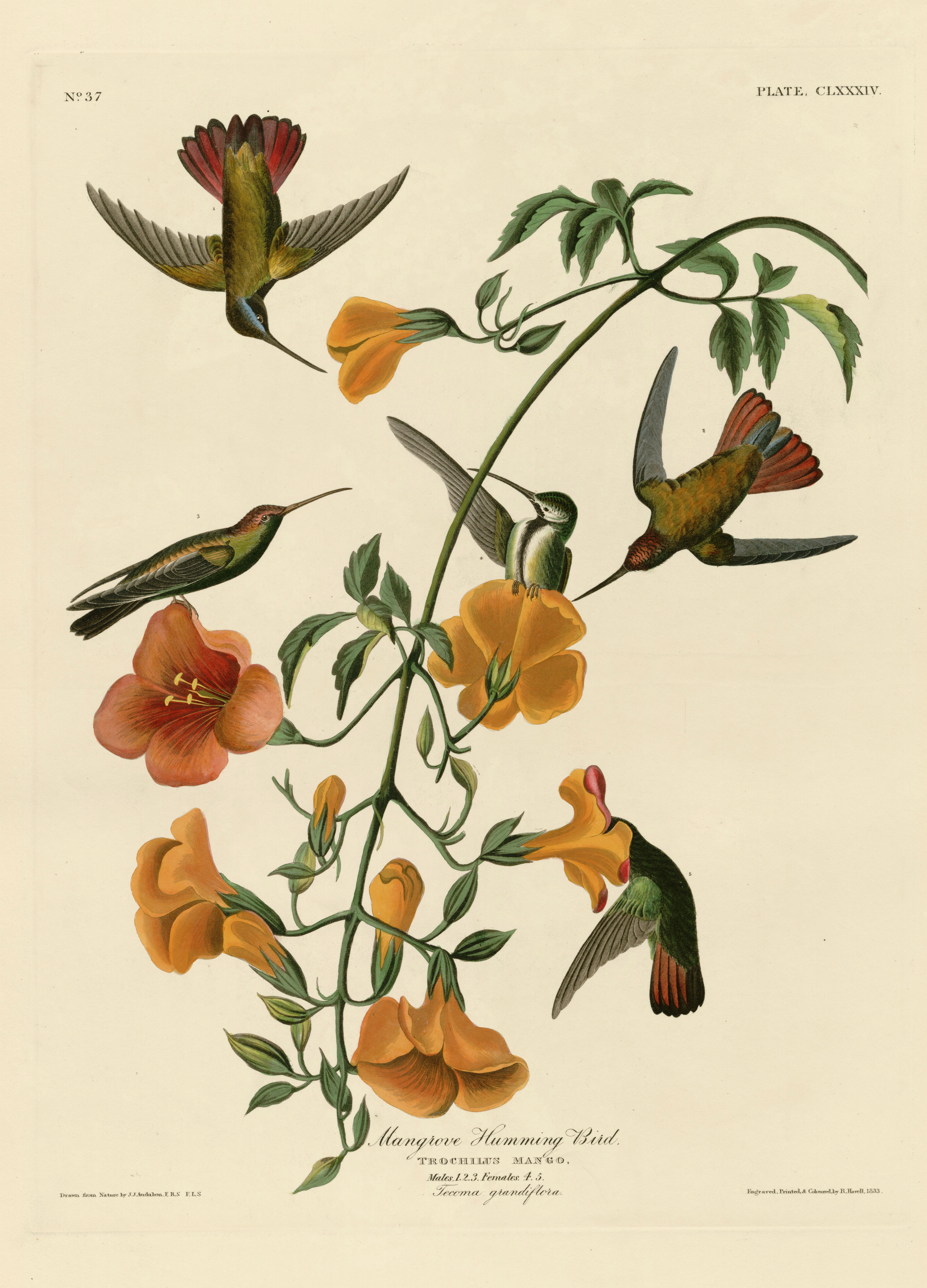 The Antillean mango is a species of hummingbird found on several Caribbean Islands. John Gould painted this pair of birds for his book “A monograph of the Trochilidae, or family of hummingbirds” Volume 2 (1861).