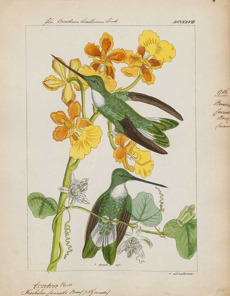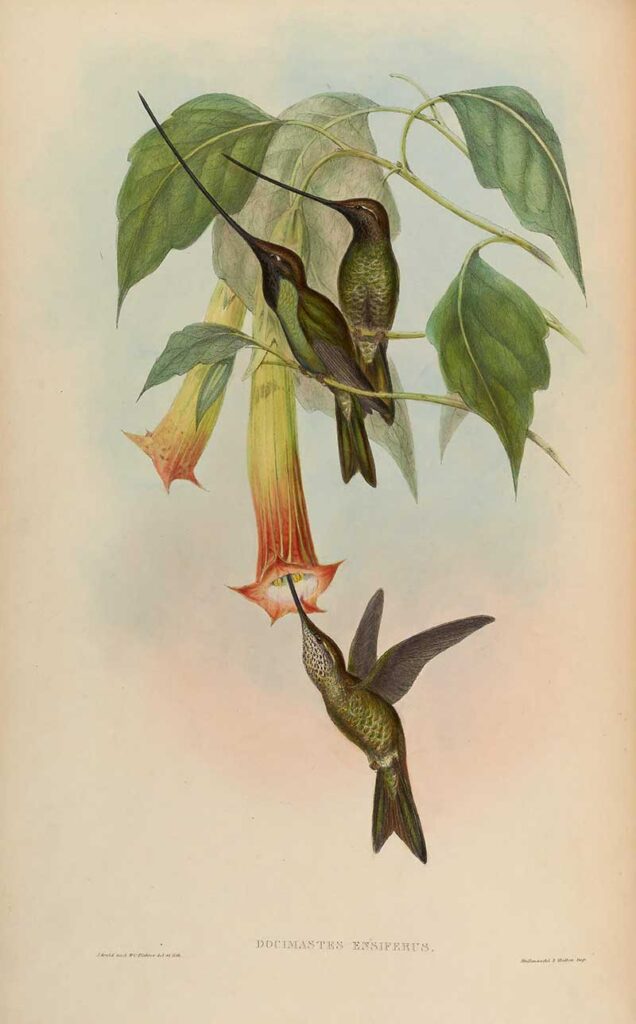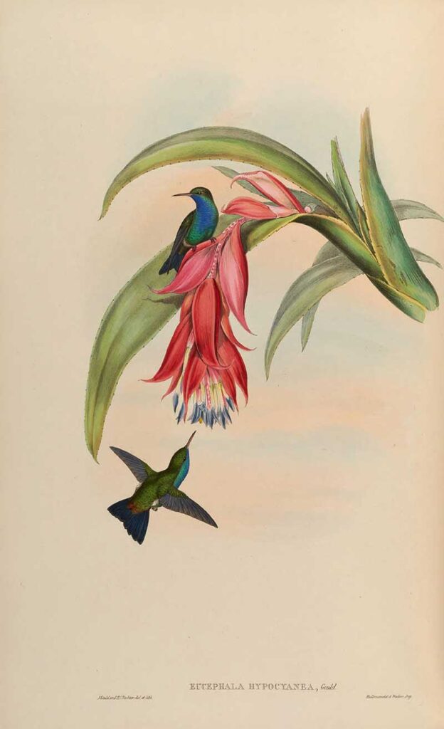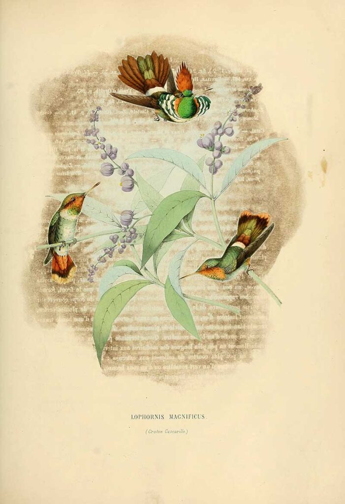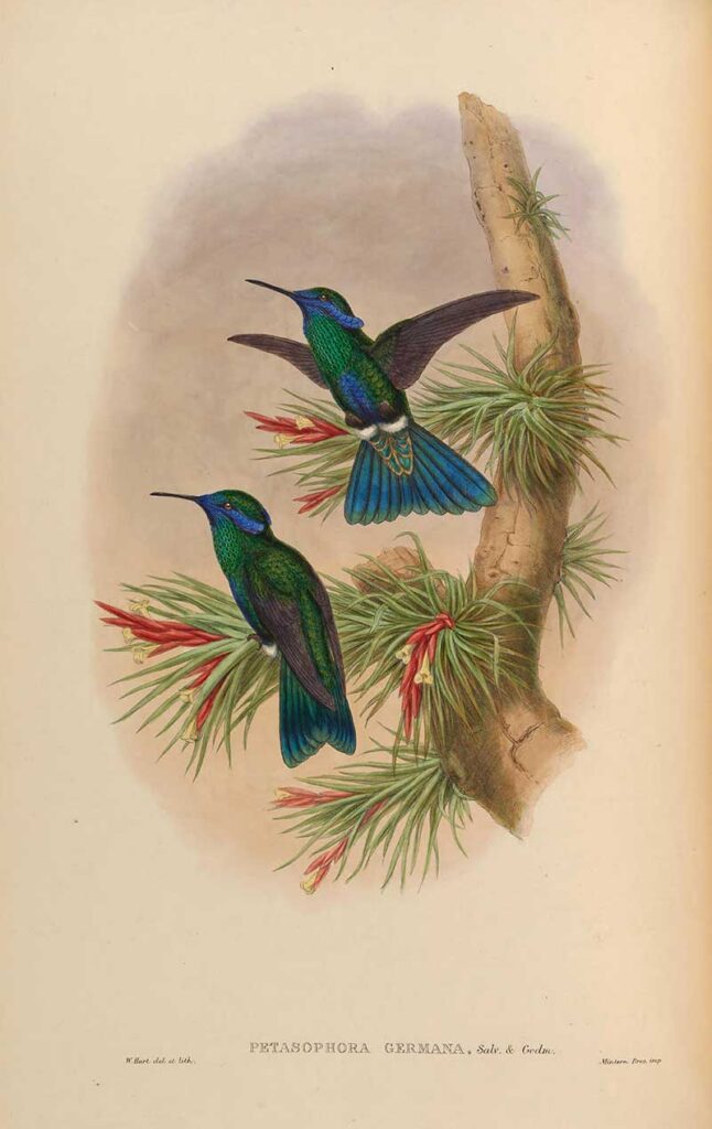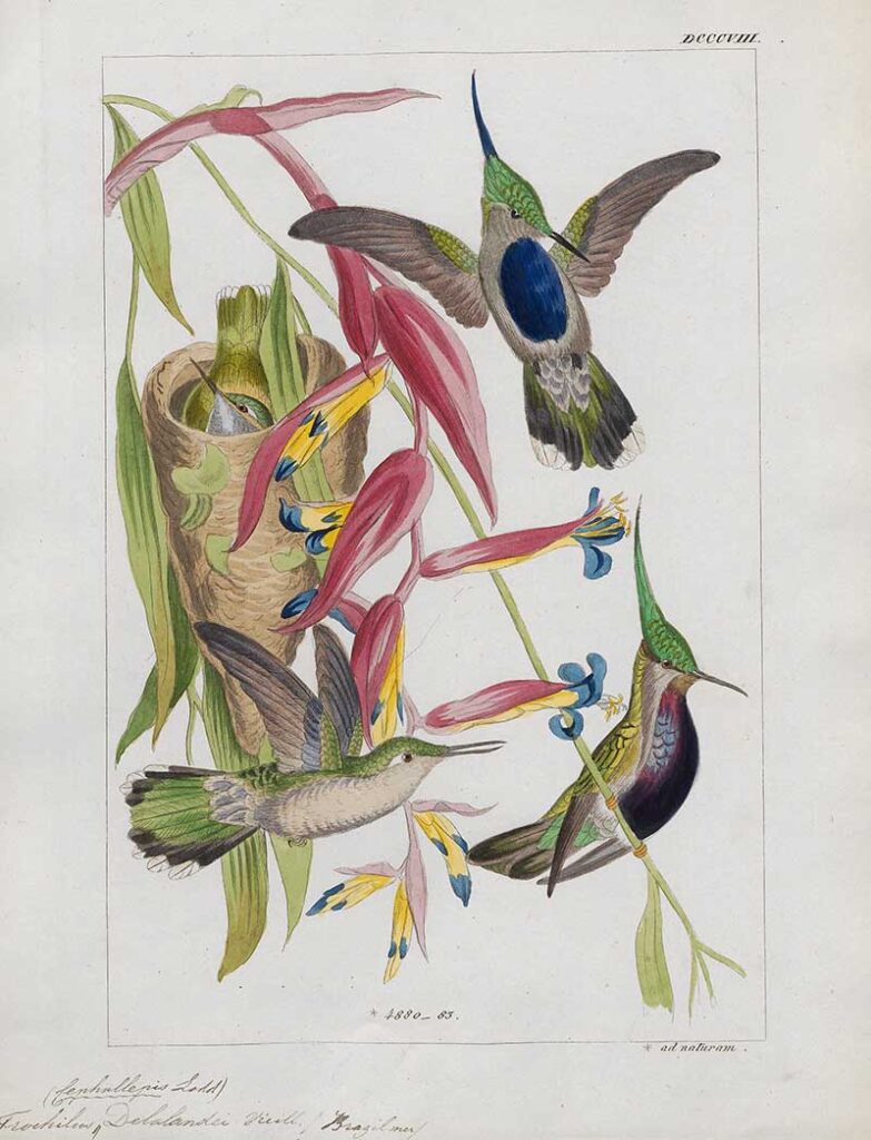From the book “Histoire naturelle des oiseaux-mouches, ou, Colibris” (Natural History of Hummingbirds), by Louis Victor Bevalet, (1877).