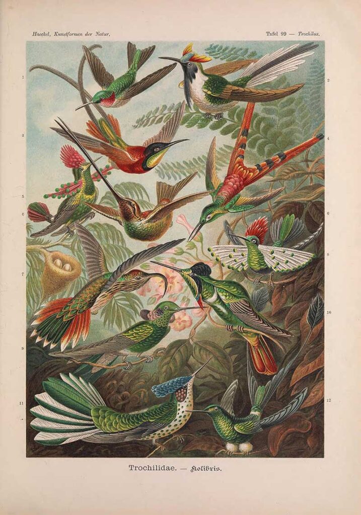 After coming across Ernst Haeckel’s beautiful hummingbird poster from his “Kunstformen der Natur” (Artforms of Nature), I was inspired to curate this collection of vintage hummingbird illustrations.
