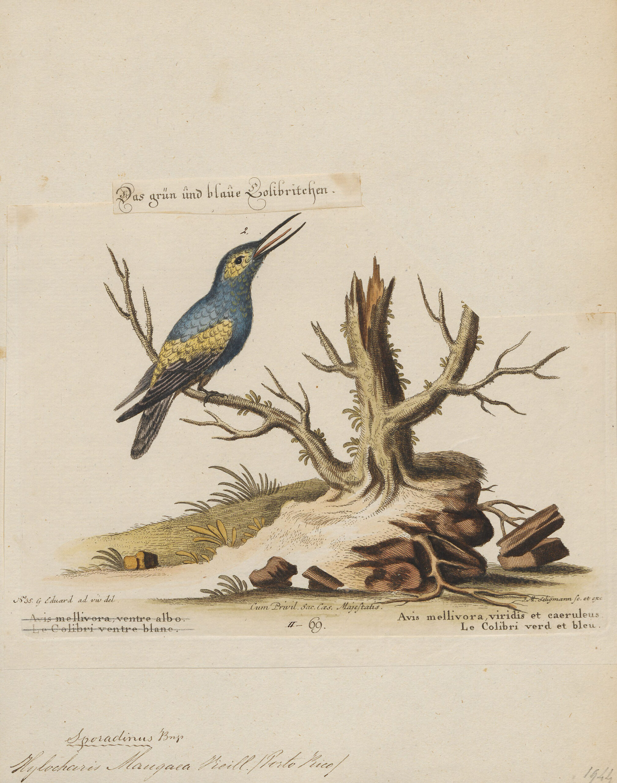 This hummingbird is only found in Puerto Rico. The painting is by George Edwards and from the Iconographia Zoologica at the University of Amsterdam.