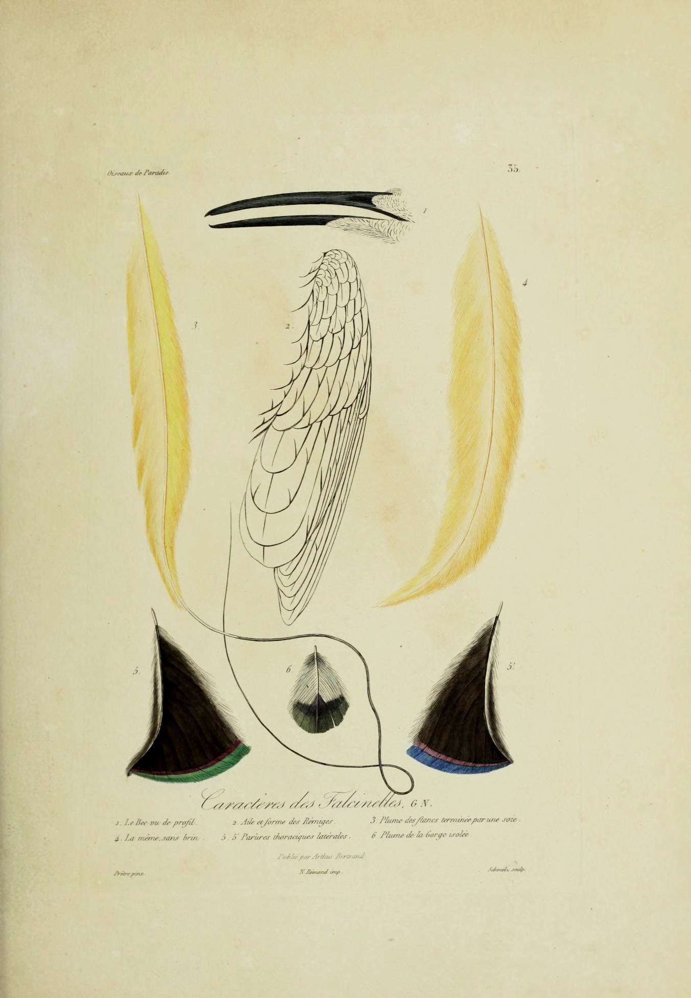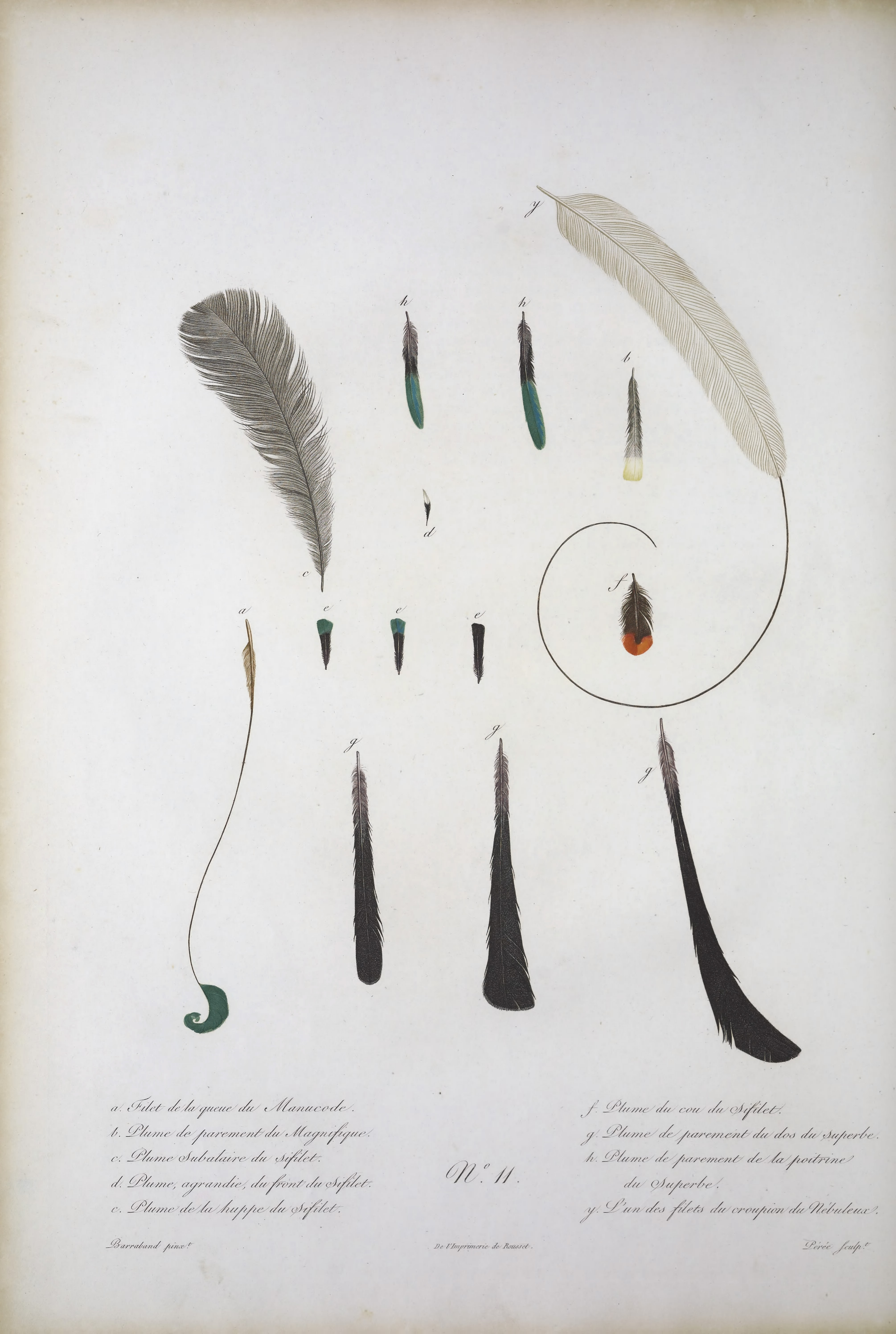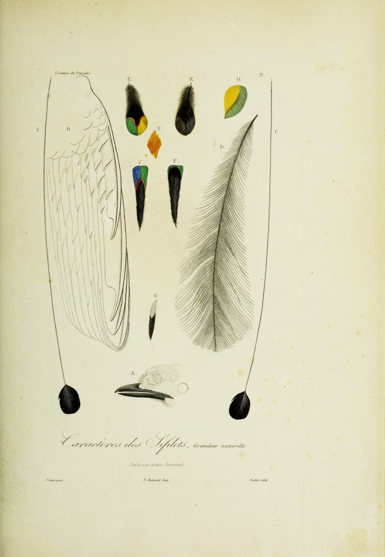 Plumage from birds of paradise. The plate is from the book “Histoire naturelle des oiseaux de paradis et des épimaques” by R. P. Lesson 1835.