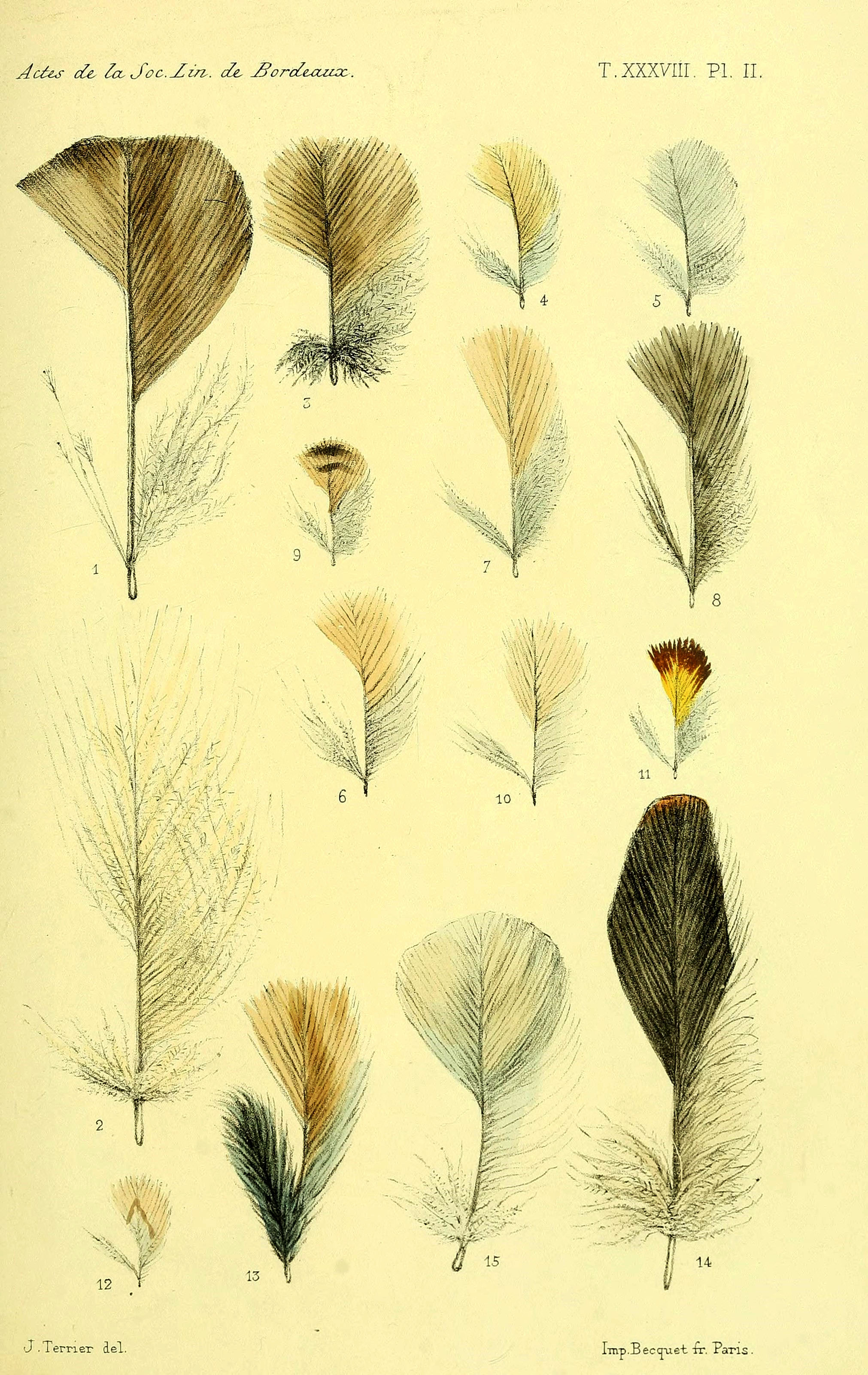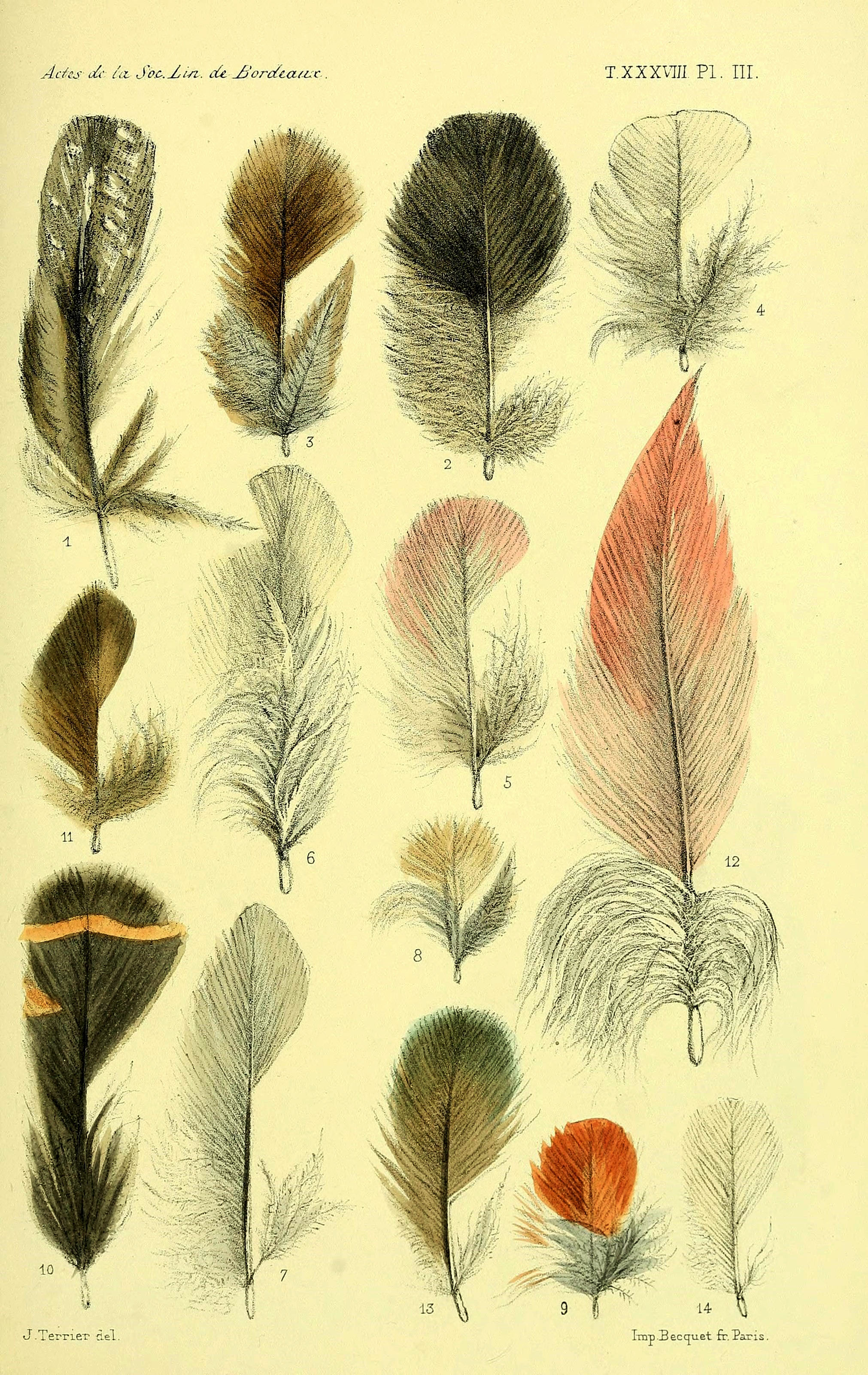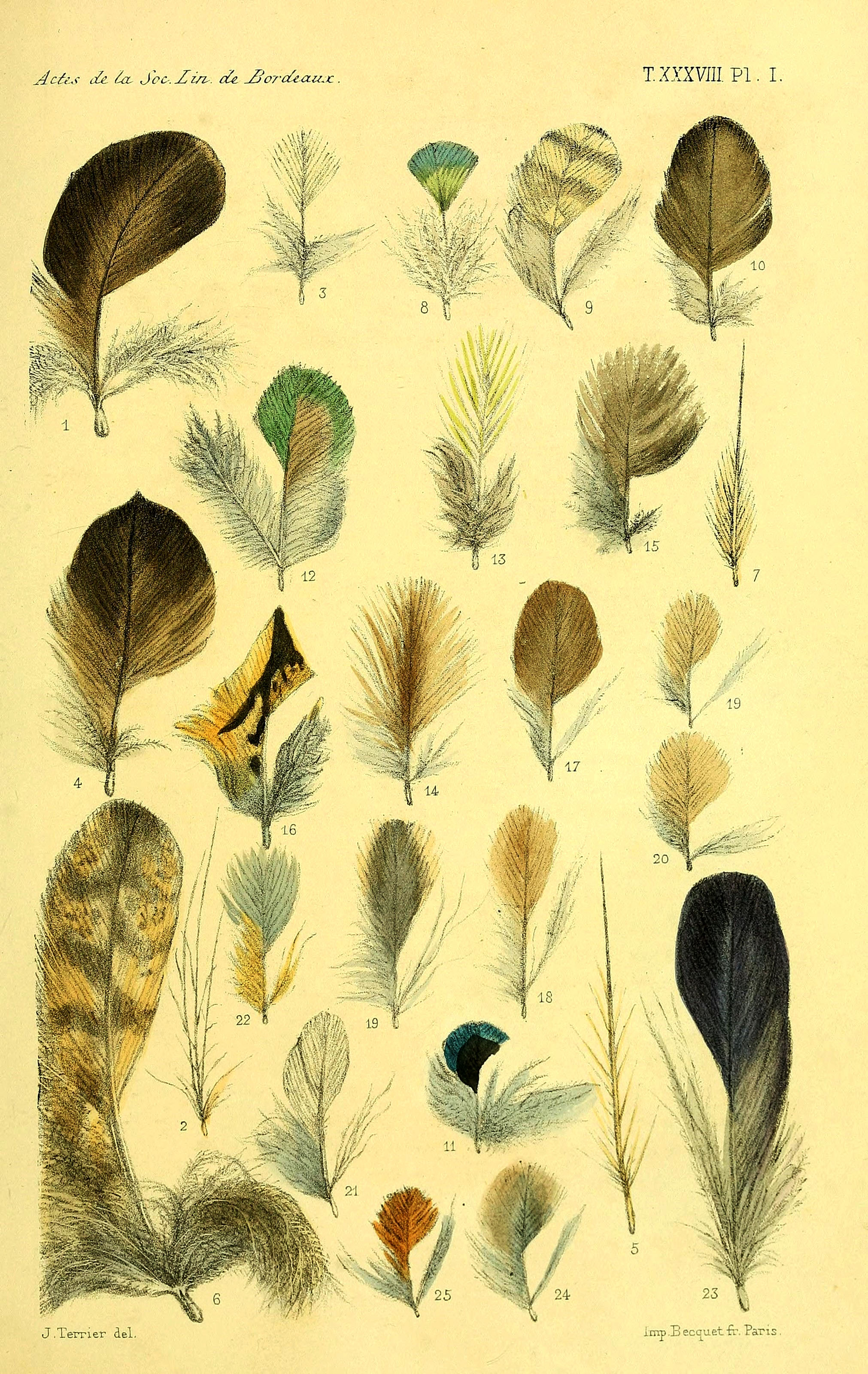 These feather drawings and prints are from the book ” Faune de la Sénégambie” by Tremeau de Rochebrune, Alphonse (1883-1887).