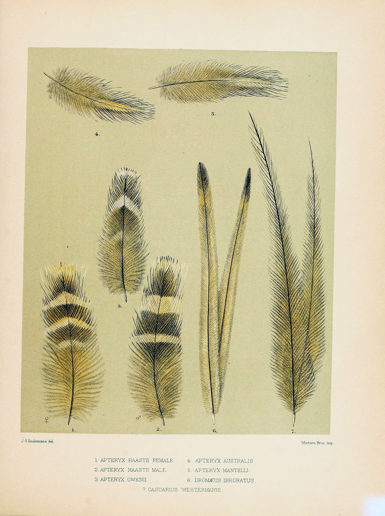 This collection of Kiwi feather drawings is from the book “Ornithological miscellany” by Edgar Allen et al 1876.