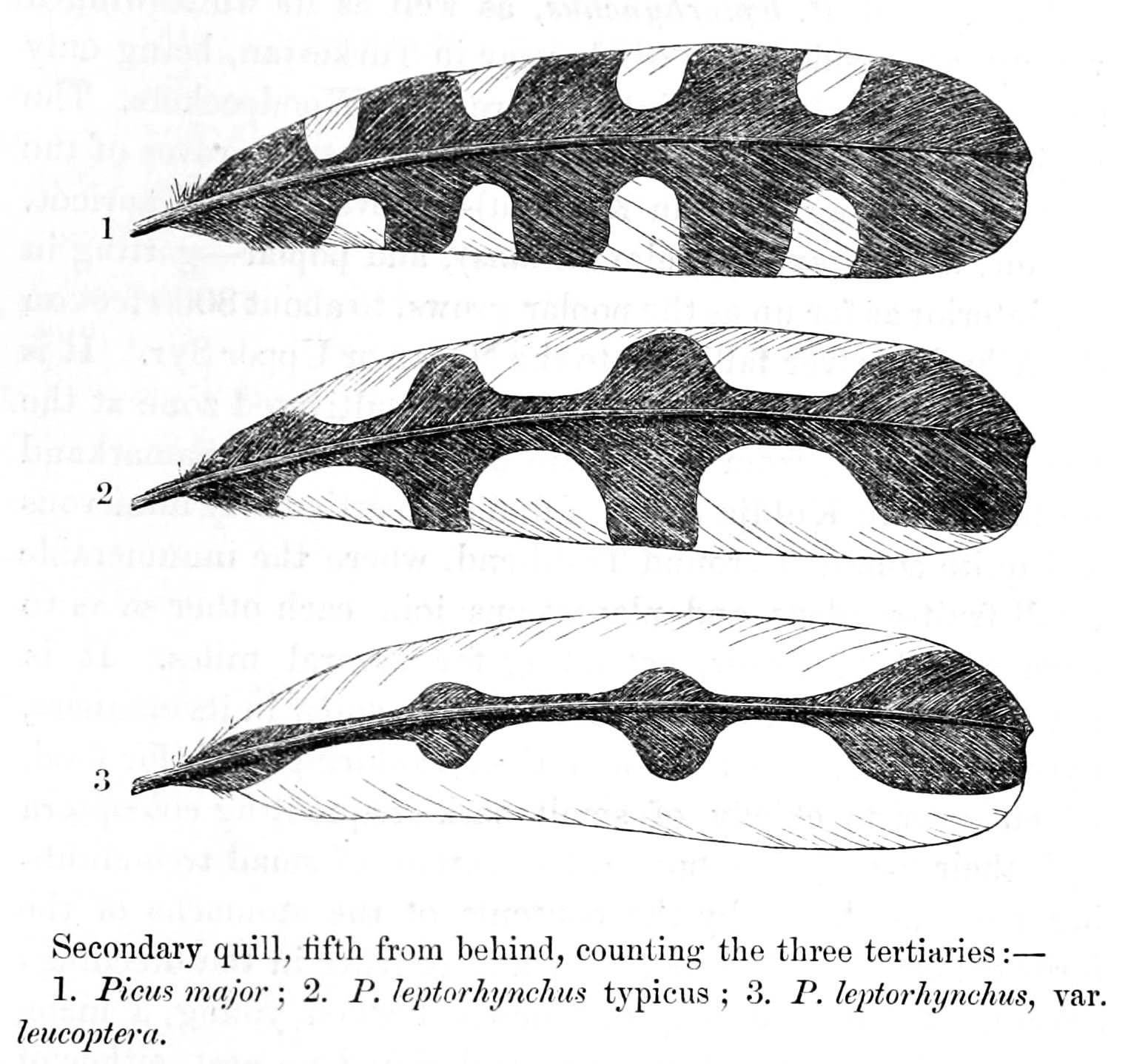 A black and white drawing of three different woodpecker feathers by John Gerrard Keulemans (1875).