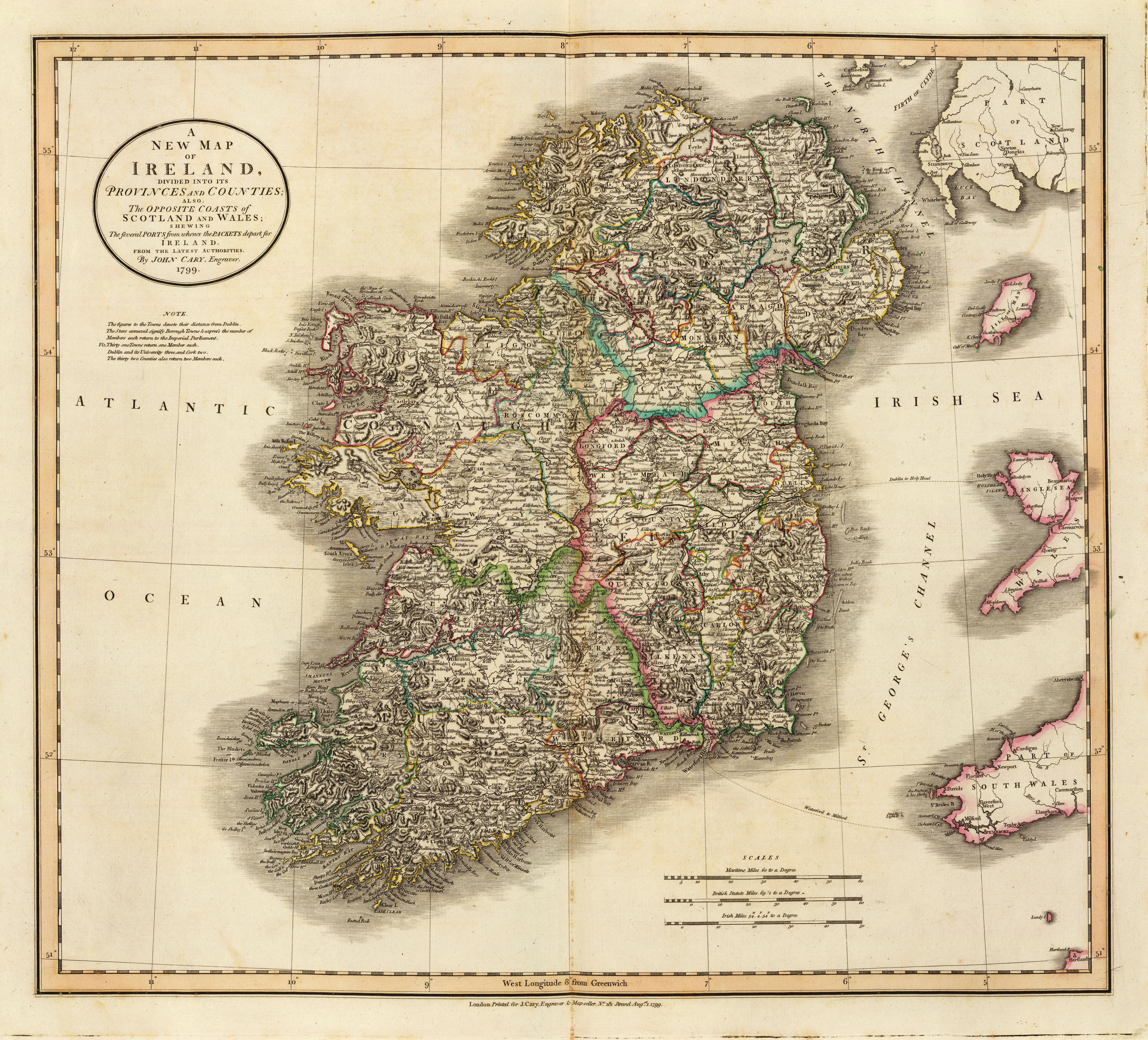 This Map depicts the Emerald Isle in considerable detail with color-coding at the county and province level. Also includes parts of nearby Scotland and Wales. Figures above many of the town names denote distance along the roads from Dublin. Prepared in 1799 by John Car.y