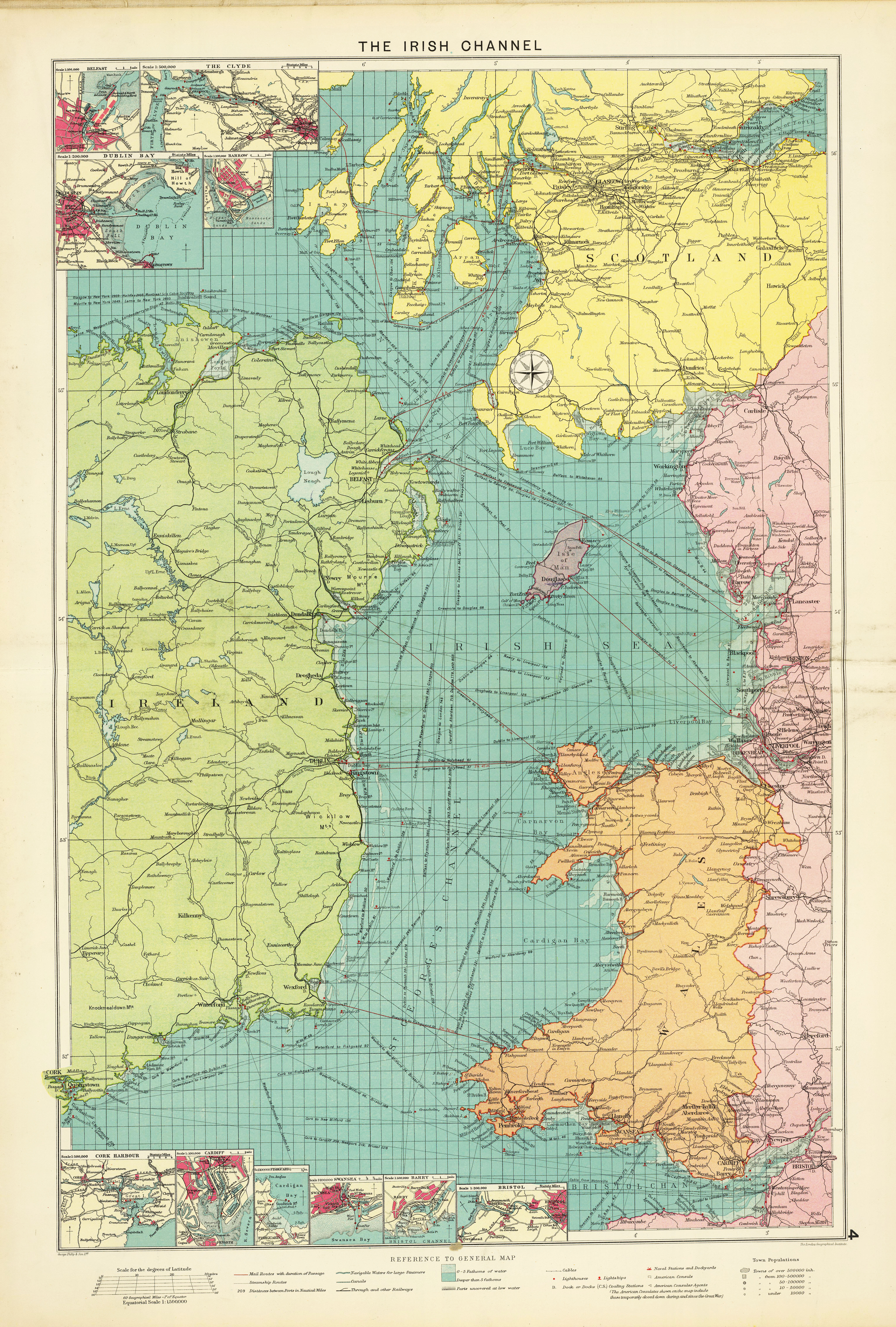 A sea route map of the Irish Channel. Shows mail routes and duration, steamship routes, distances, navigable waters for large steamers, canals, principal railways, cables, lighthouses, lightships, docks, coaling stations, British and American consular offices, naval stations, dockyards, etc.