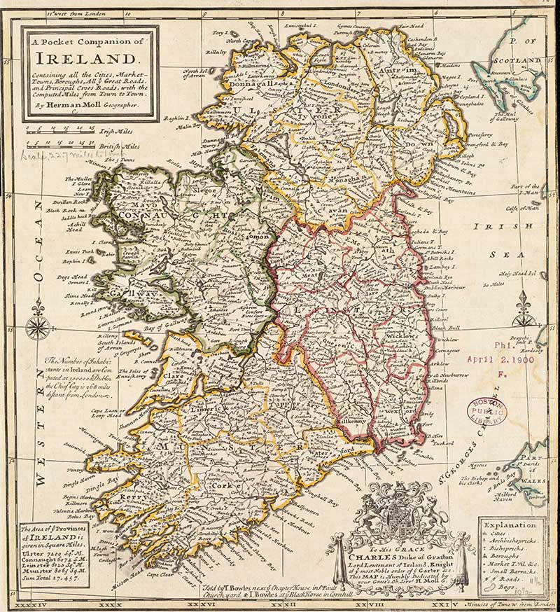 A pocket companion of Ireland, containing all the cities, market towns, boroughs, all ye great roads, and principal crossroads with the computed miles from town to town, by Herman Moll.
