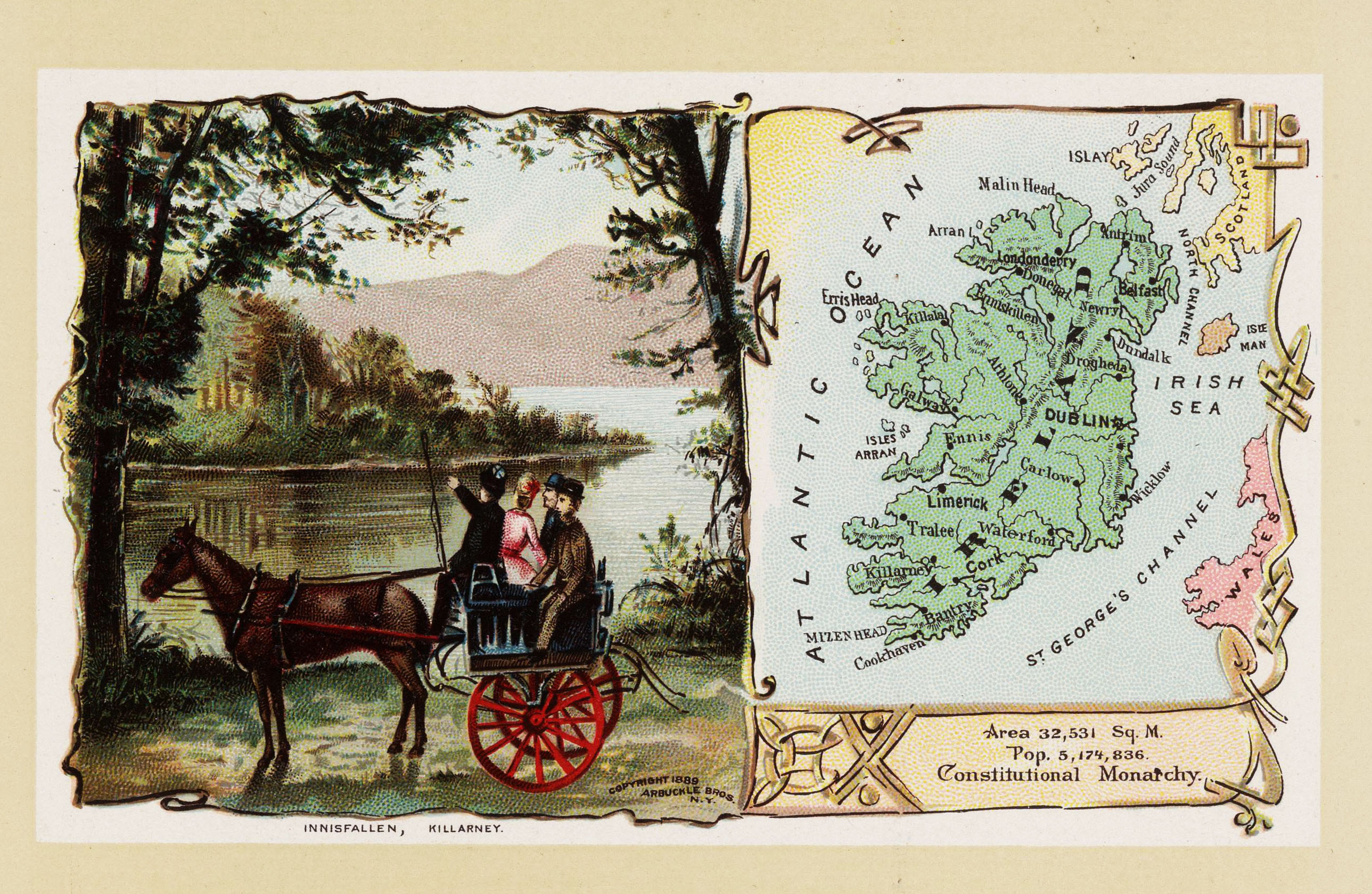 The constitutional monarchy of Ireland is depicted by a group of sightseers in a horse-drawn cart at Innisfallen, Killarney. From “Arbuckles’ Illustrated Atlas of Fifty Principal Nations of The World“, 1889, by Arbuckle Bros.