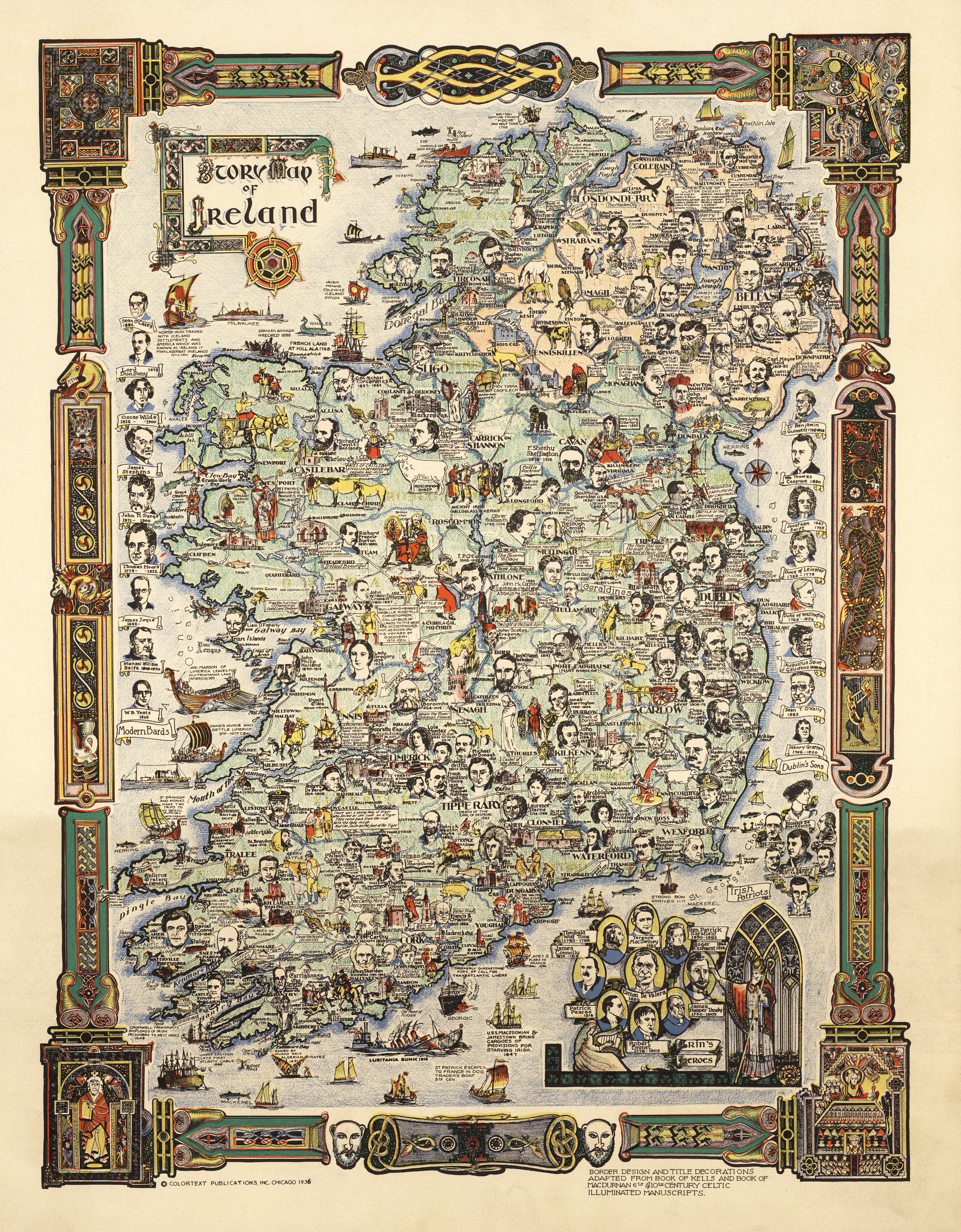 1936 Pictorial vintage maps of Ireland showing colorful map featuring portrait illustrations of historical figures and writers, buildings, literary figures, landscape features, ships and boats, animals, etc.