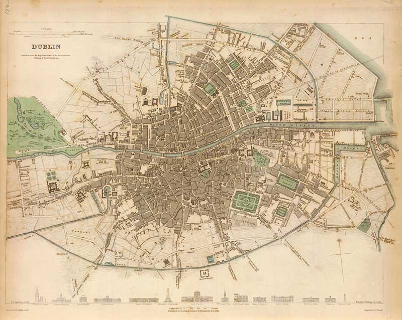 Engraved map of the capital city of the Republic of Ireland. A hand colored map, it Includes drawings of 14 structures “A comparison of the principal buildings in Dublin.”