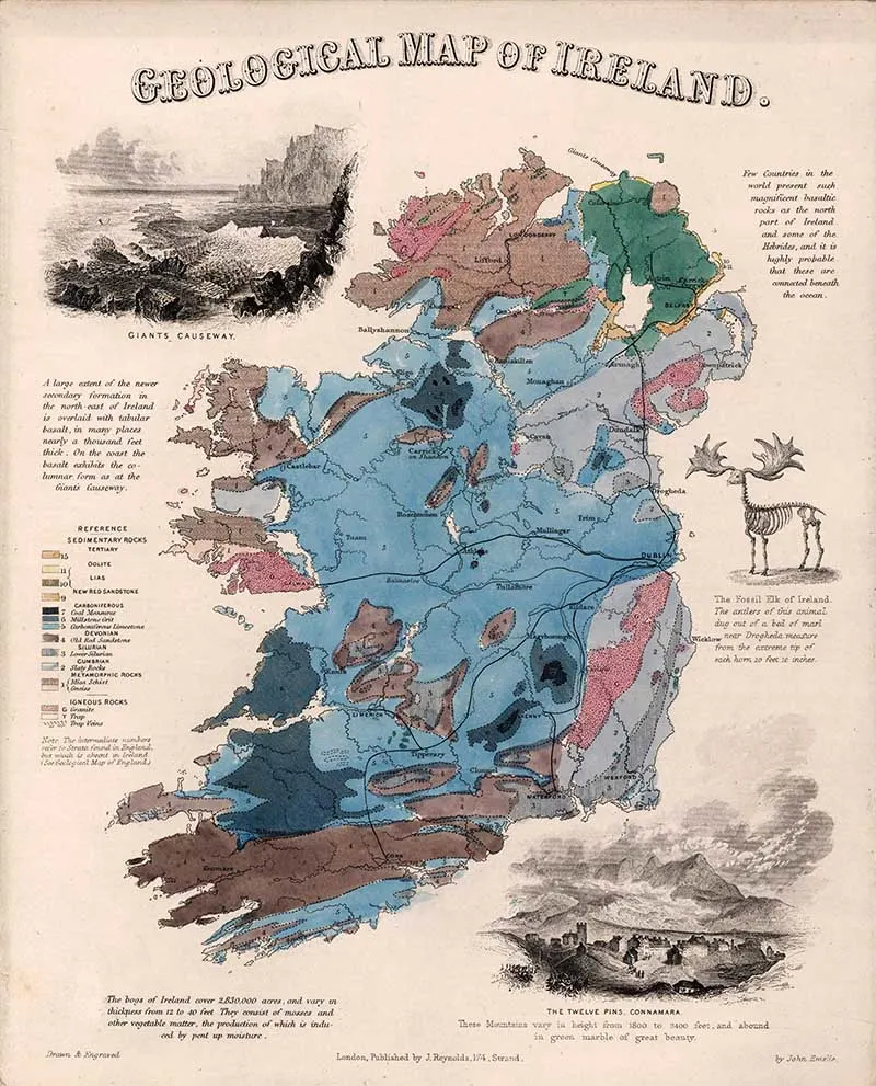 Hand color engraved map, showing areas of rock formations in Ireland. Includes color-coded reference identifying the geologic rock formation, and text (1849). Includes views of the Giant’s Causeway, (with) The Twelve Pins, Connamara. (with) Fosilelk of Ireland.