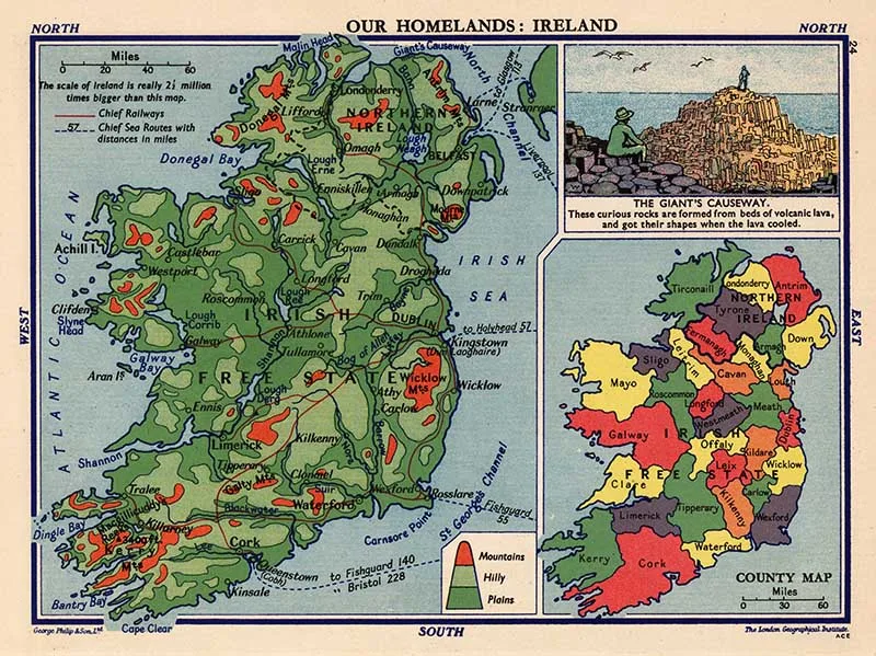 Educational vintage map of Ireland from “Philips’ Pictorial Atlas of the World showing Where and How People Live” (1935).