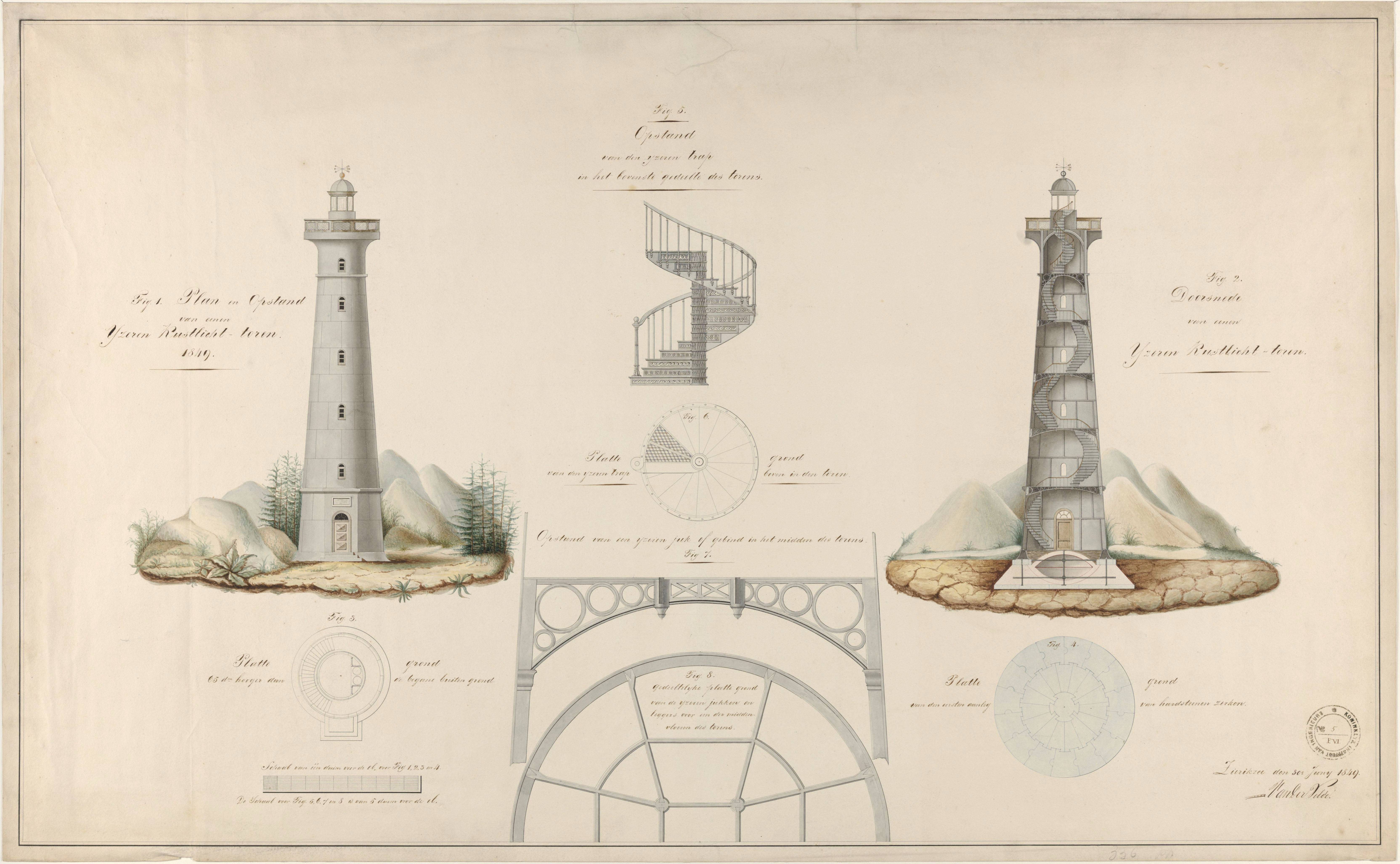 A sheet with construction drawings with the title ‘Plan and elevation of an iron coastal light tower 1849’.
