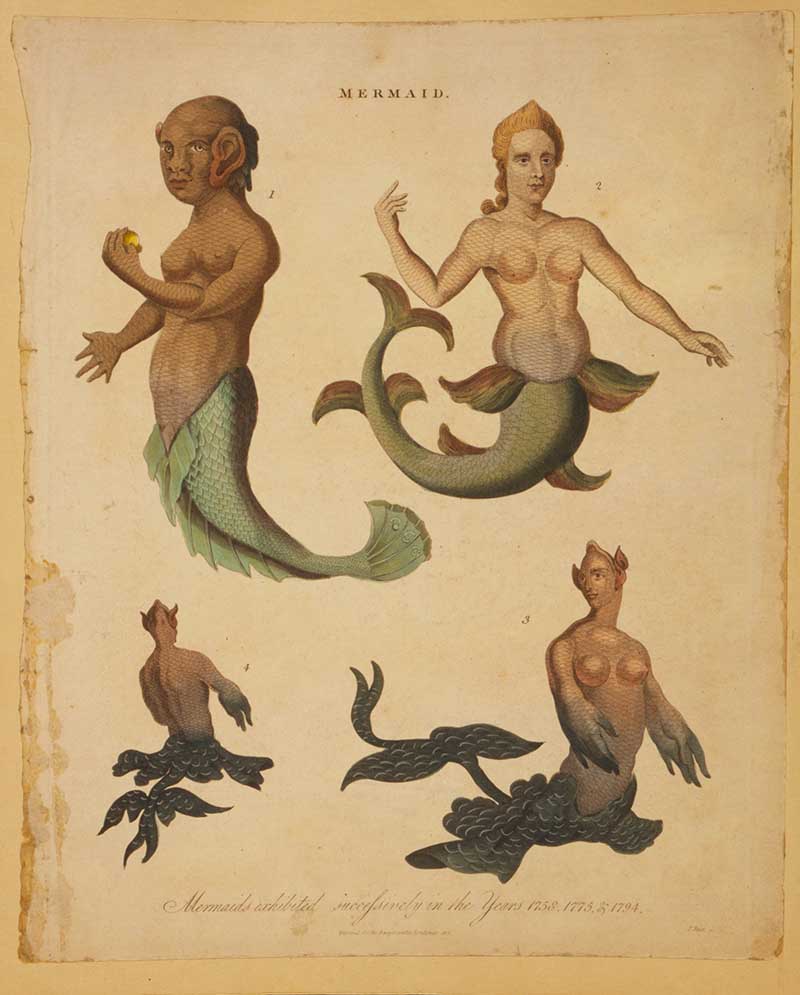 The hand-coloured engraving from 1817 by John Paas is titled “Mermaids Exhibited Successively in the Years 1758, 1775, & 1795.” The print features three different illustrations of mermaids, each purportedly exhibited during the respective years mentioned in the title.
