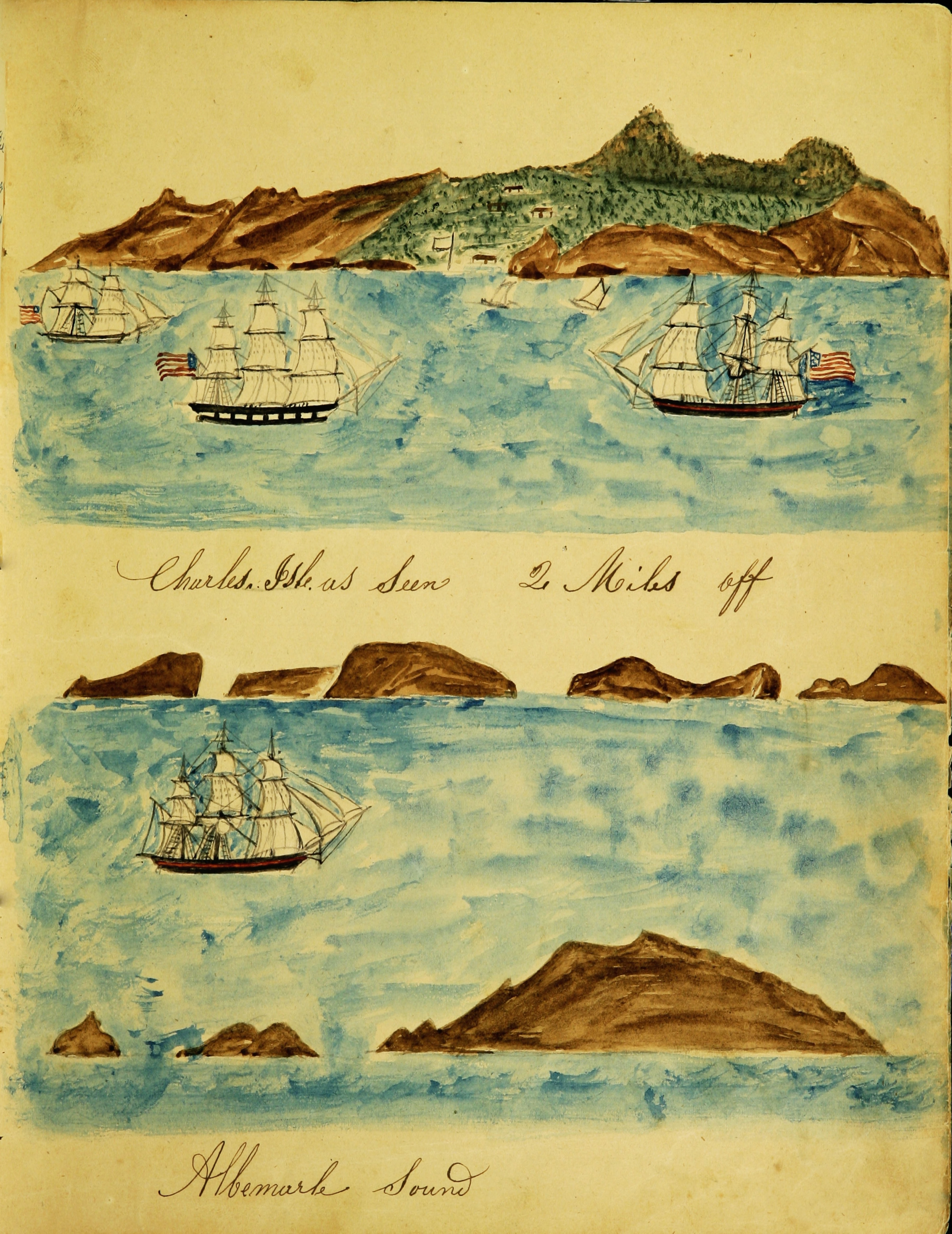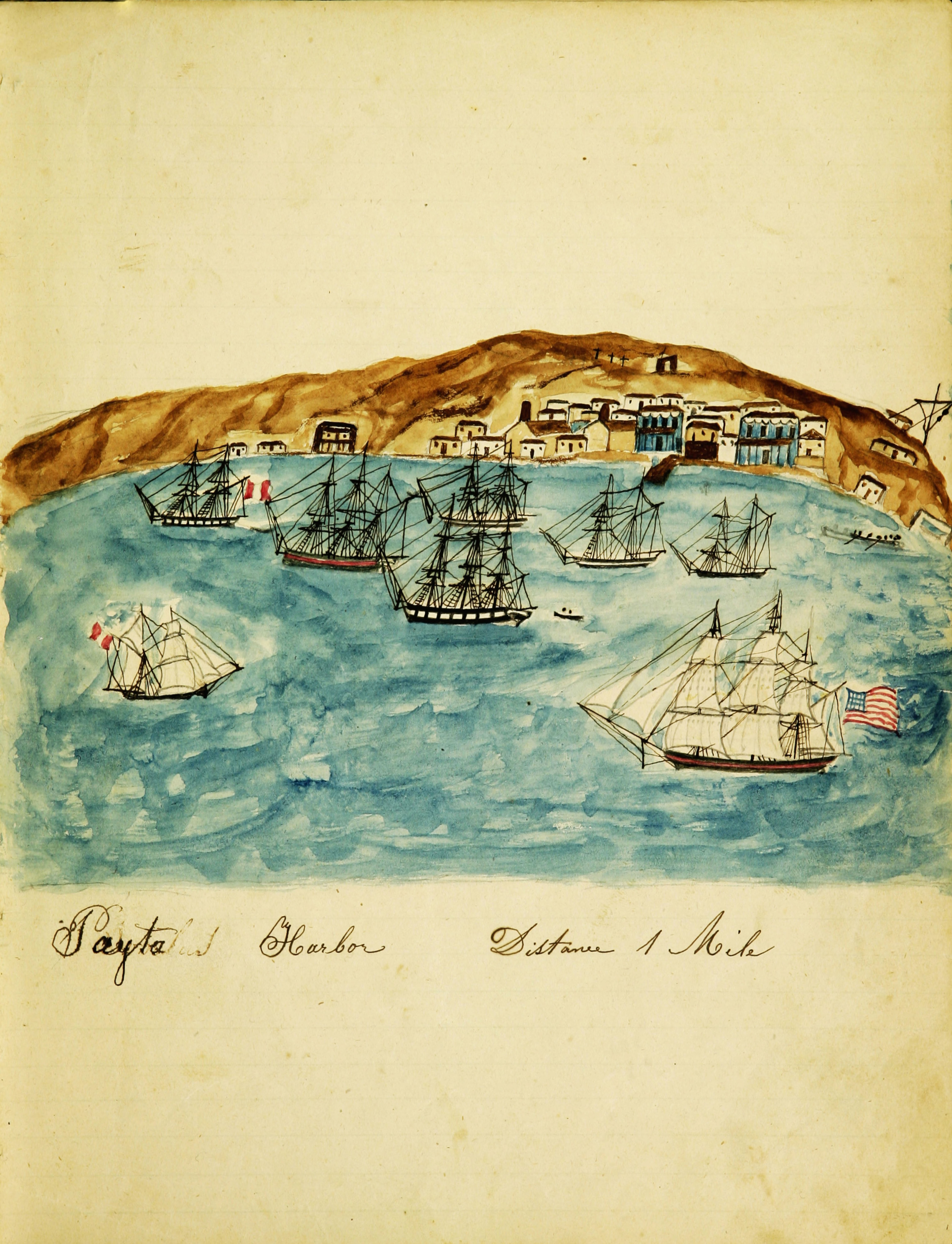 The following two vintage maritime paintings of ships are from the MS220 Log 347 of the ship Nauticon, 1849. This journal was written by Susan C. Austin Veeder, which documents her experiences in the whaling industry and contains some beautiful illustrations of vessels from this period.