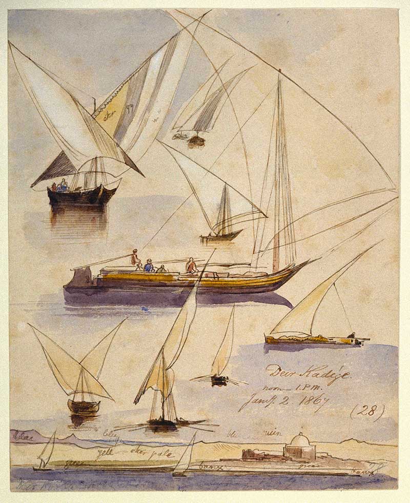 A watercolour painting of various Egyptian boats, including dahabeahs and gyassis. Some vessels are portrayed individually on a stretch of calm, reflecting water. At the bottom of the sheet is a view of the river with a mosque on the far bank. Edward Lear appears to have taken the scenes from aboard a ship while travelling along the Nile between noon and 1 pm on 2 January 1867.