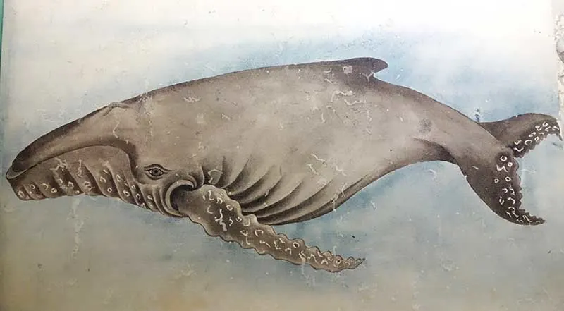 A Japanese woodblock print of a whale from the Edo period, exhibited at the Tokyo National Museum.