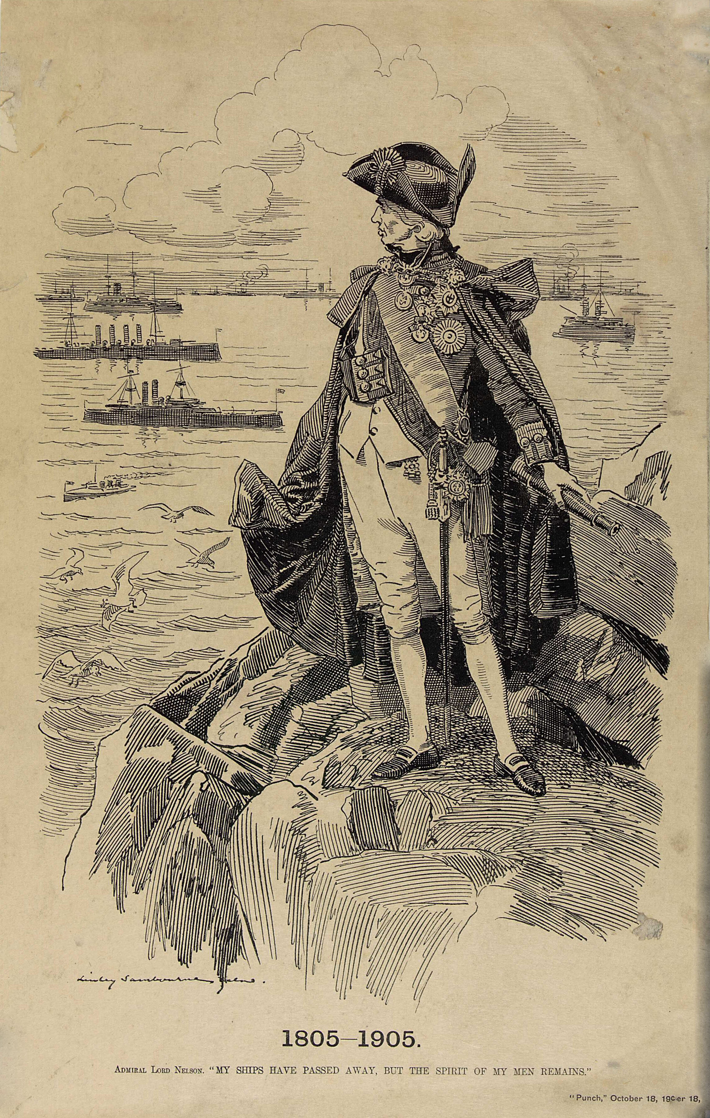 A cartoon from the magazine, ‘Punch’, 18 October 1905, acknowledging the British debt to Nelson in the centenary week of his death. The artist shows Nelson standing on the shore of England, looking out over a fleet of British warships of the 1905 period. The image conveys that Nelson’s legacy remains even though the ships protecting Britain are no longer sailing vessels, and acknowledges the debt the contemporary navy and the nation still owe him.