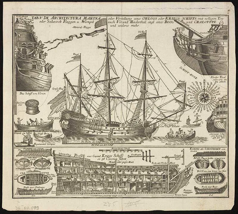 An 1800 Polish drawing of the design of a wooden warship.