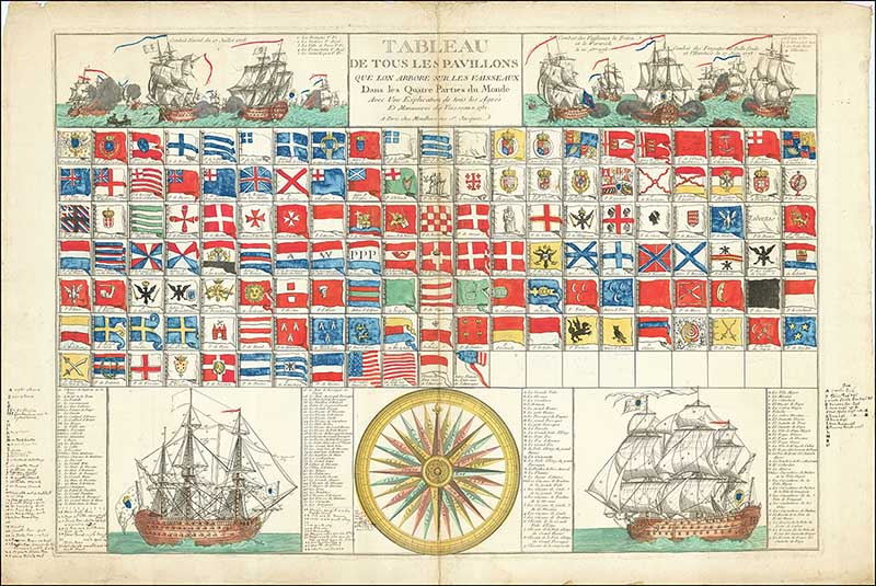 This vintage nautical illustration is by Louis Joseph Mondhare. The translated title is “Table Of All The Flags That Lon Arbore On The Vessels In The Four Parts Of The World With An Explanation Of All The Agres And Maneuvers Of The Vessels 1781.“