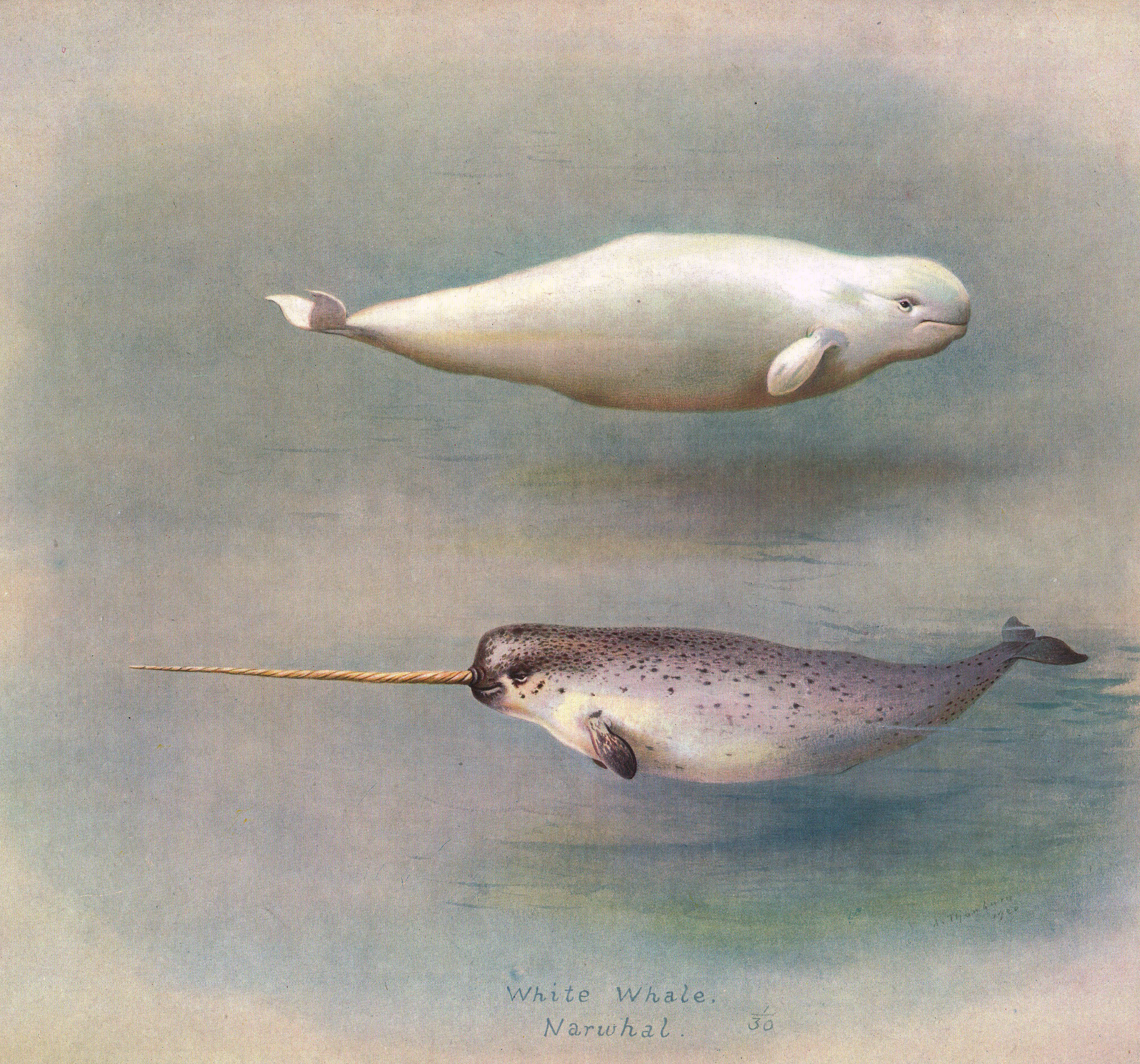 “White Whale, Narwhal” illustration from “British Mammals” by A. Thorburn, 1920
