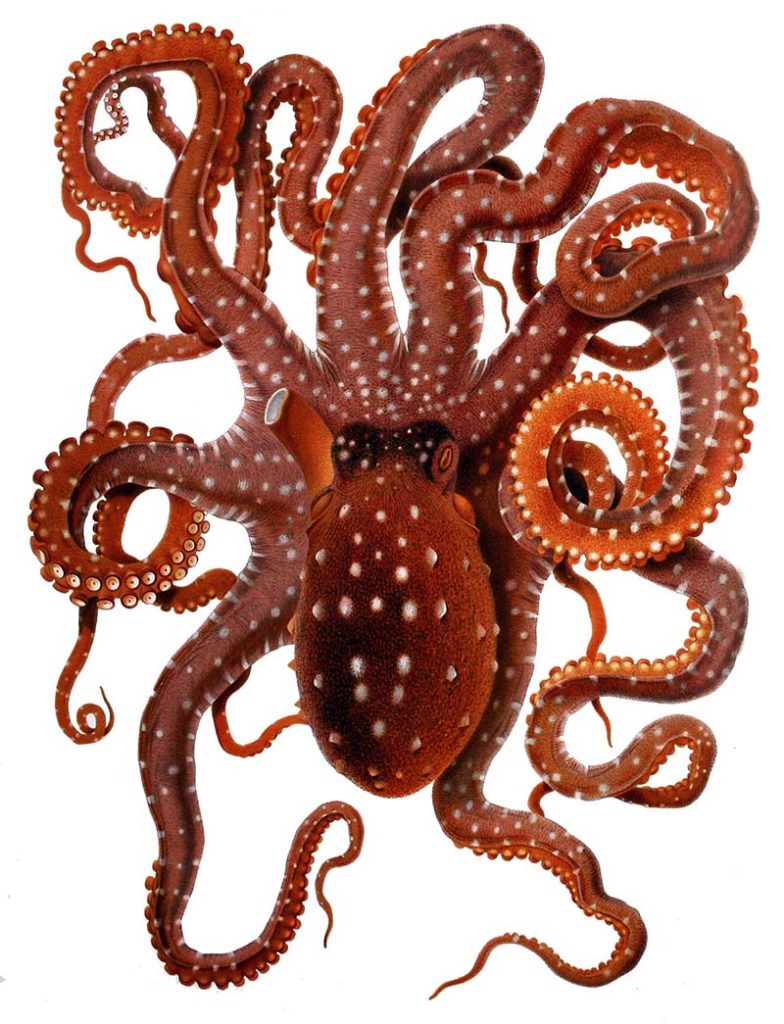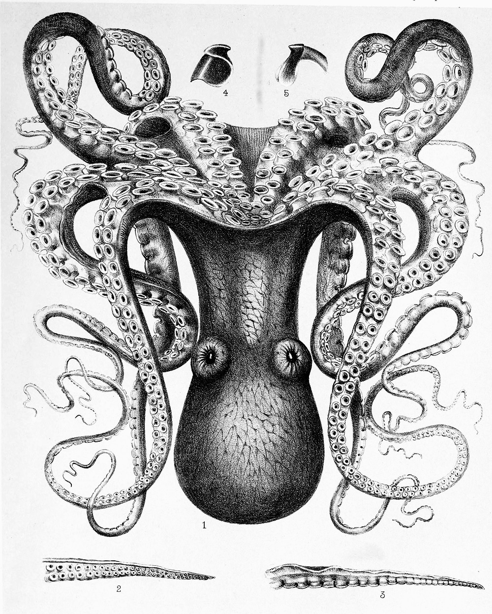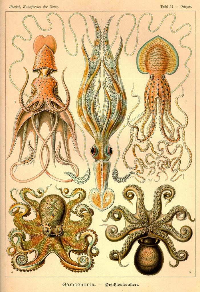A plate illustrating octopuses from Ernst Haeckel‘s Kunstformen der Natur (1904). Ernst Haeckel was a German zoologist and artist who pushed the work of theories of Charles Darwin in Germany.