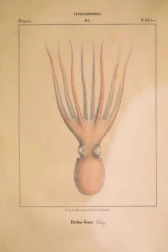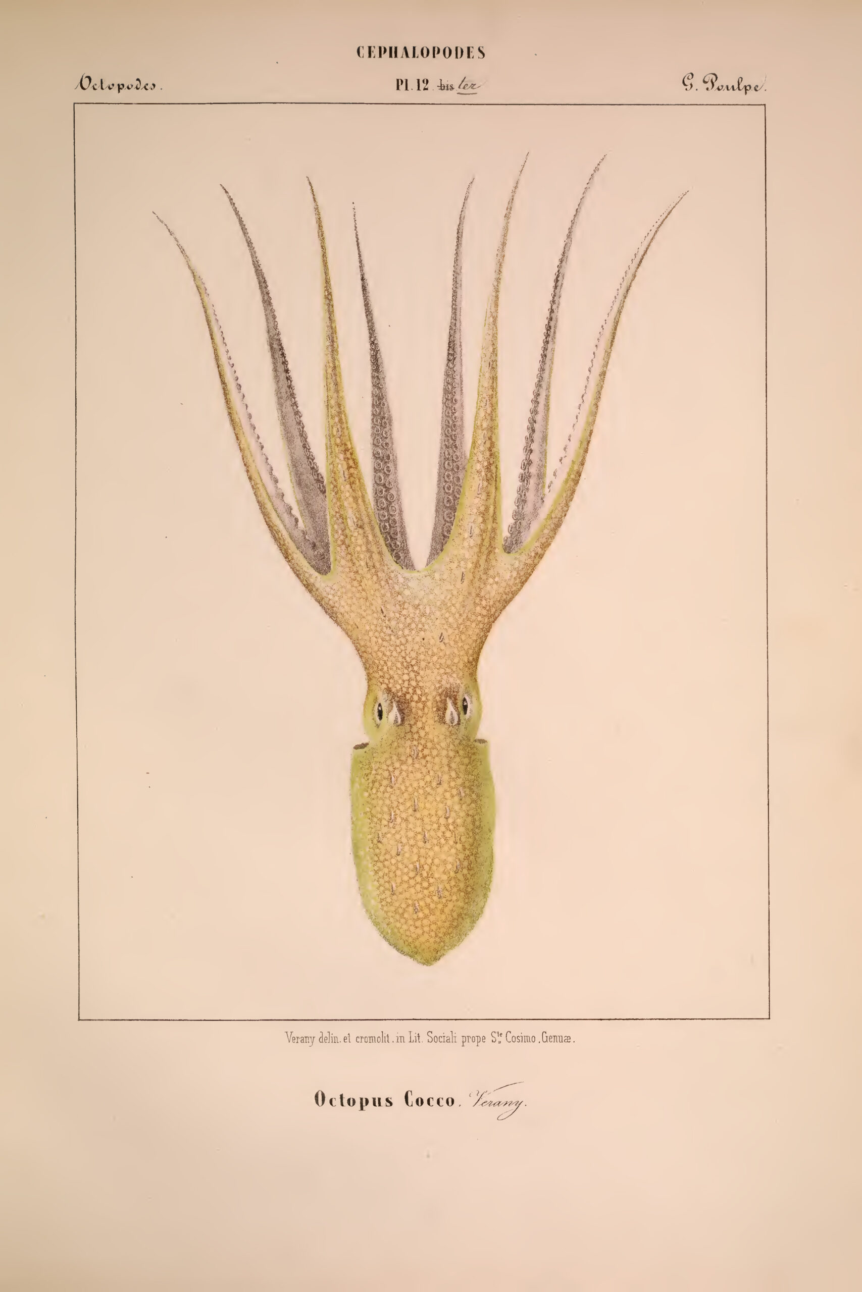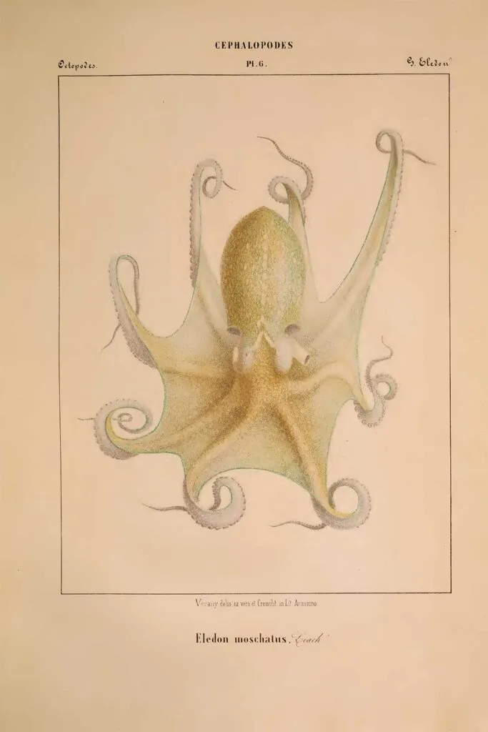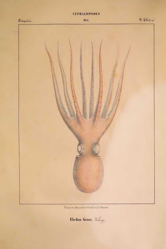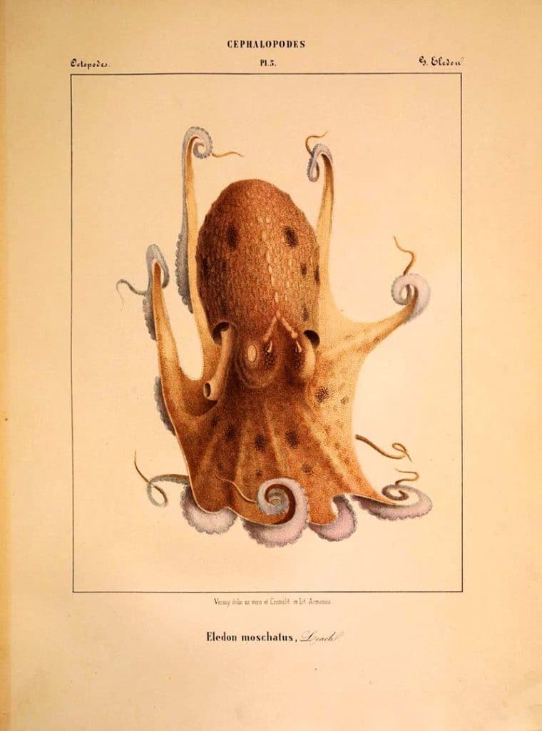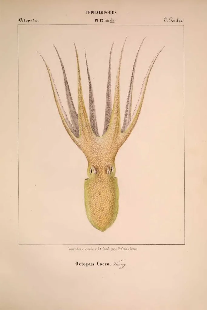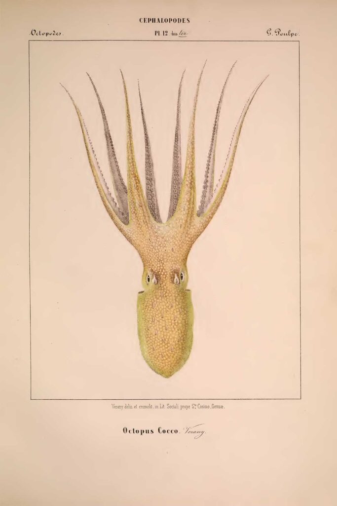 Another vintage octopus print of a Mediterranean octopus from Jean Baptiste Vérany 1851 octopus identification guide.