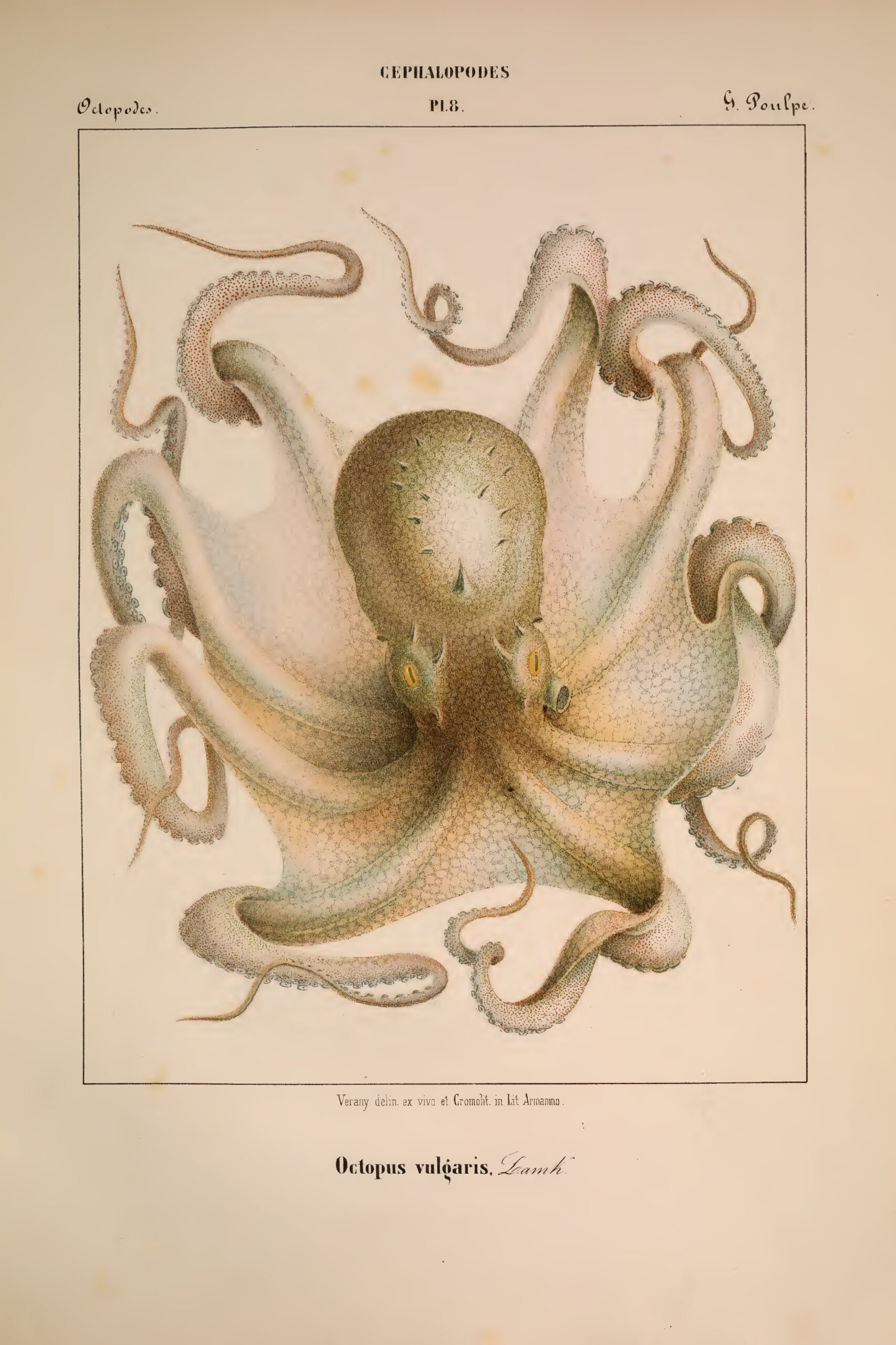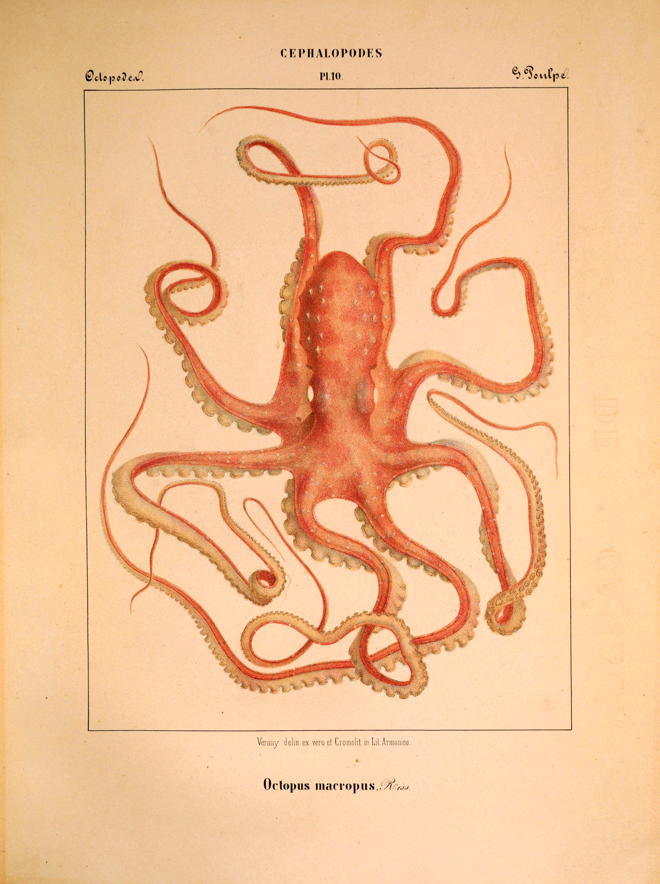 The next few vintage octopus prints are all from the same book “Mollusques méditeranéens; observés, décrits, figurés, et chromolithographiés d’après le vivant …” (Mediterranean molluscs; observed, described, figured, and chromolithographed from the living ) by Jean Baptiste Vérany (1851).