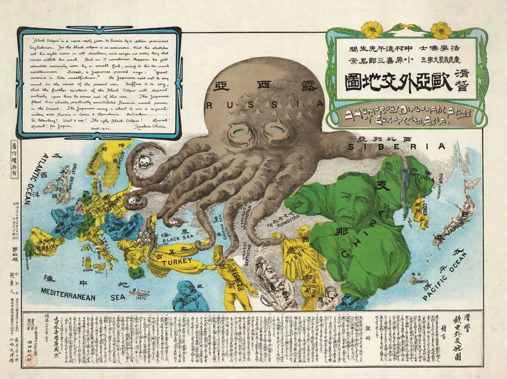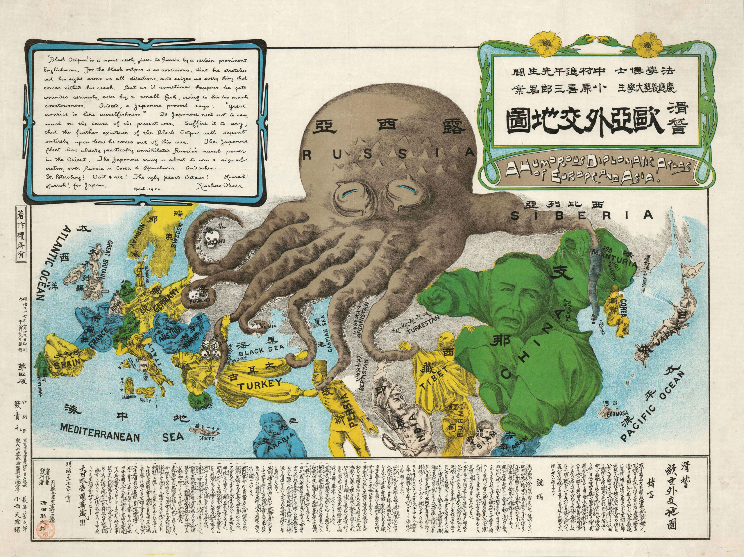 A 1904 satirical map of Asia and Europe again depicts Russia as an octopus. I think Russia is an octopus as it illustrates the country’s far reach across many countries and both continents.