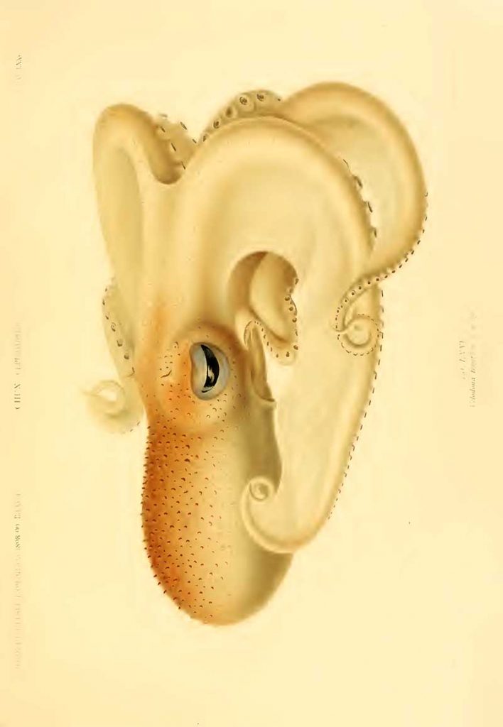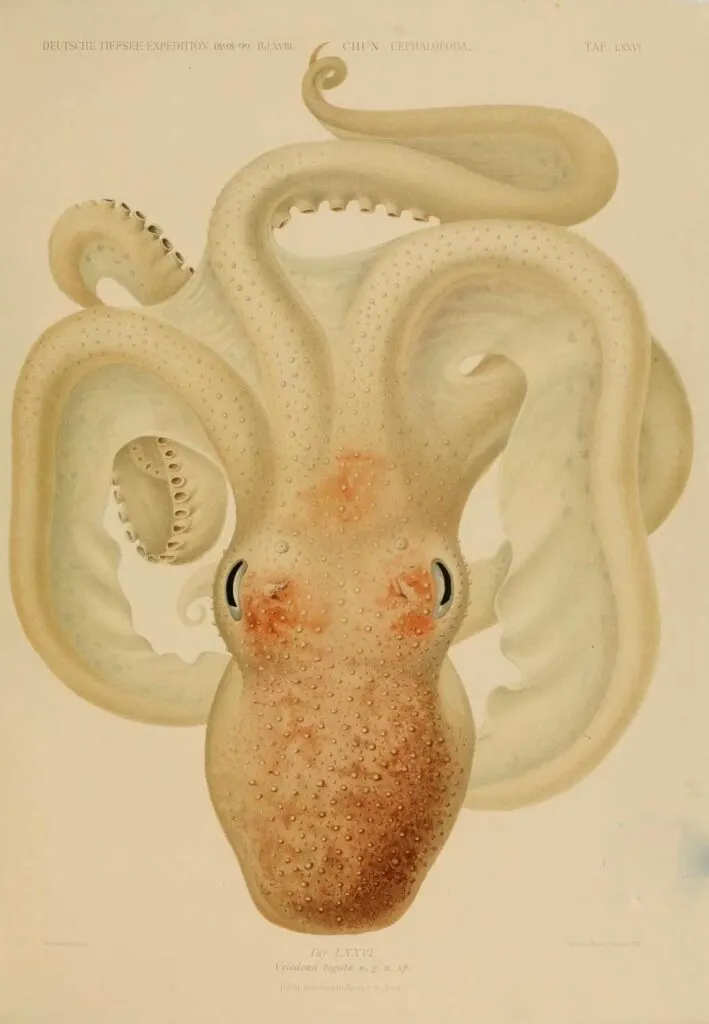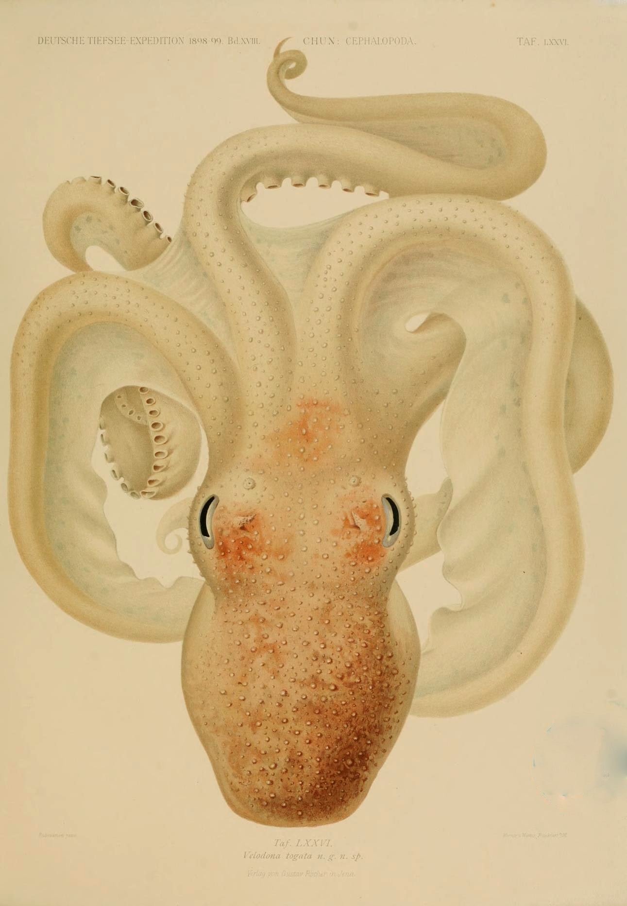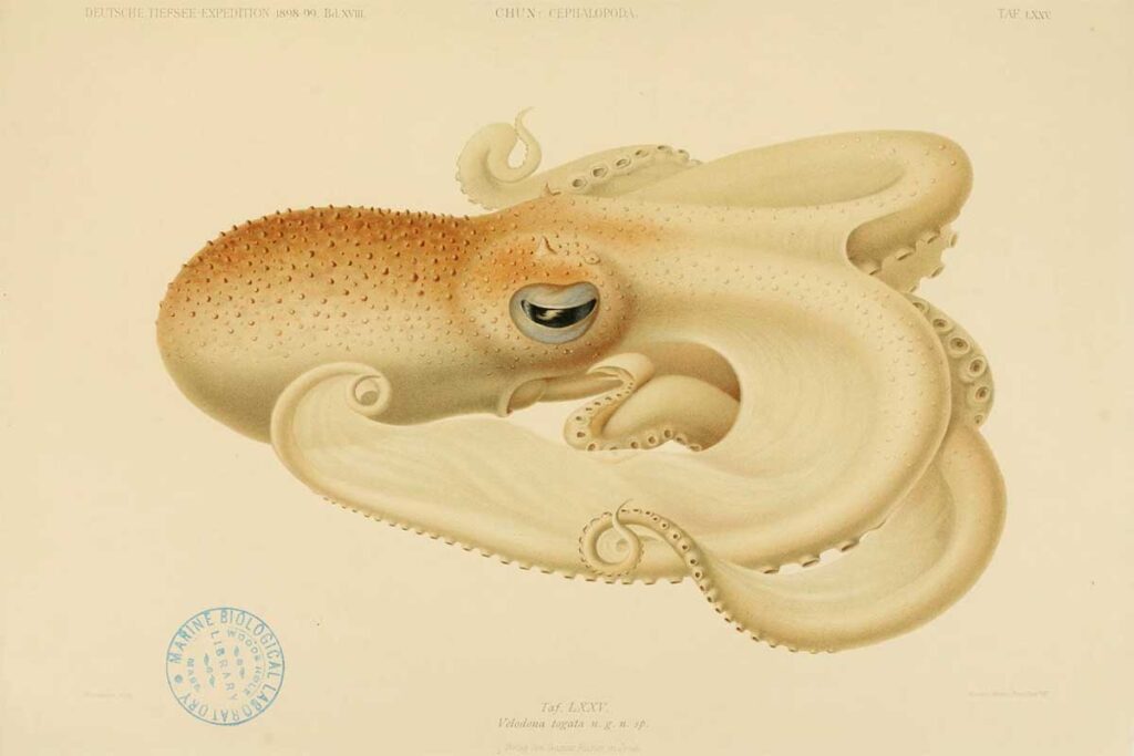 The octopus was first discovered off the coast of East Africa. It is from the book “Die Cephalopoden” by Carl Chun 1910.