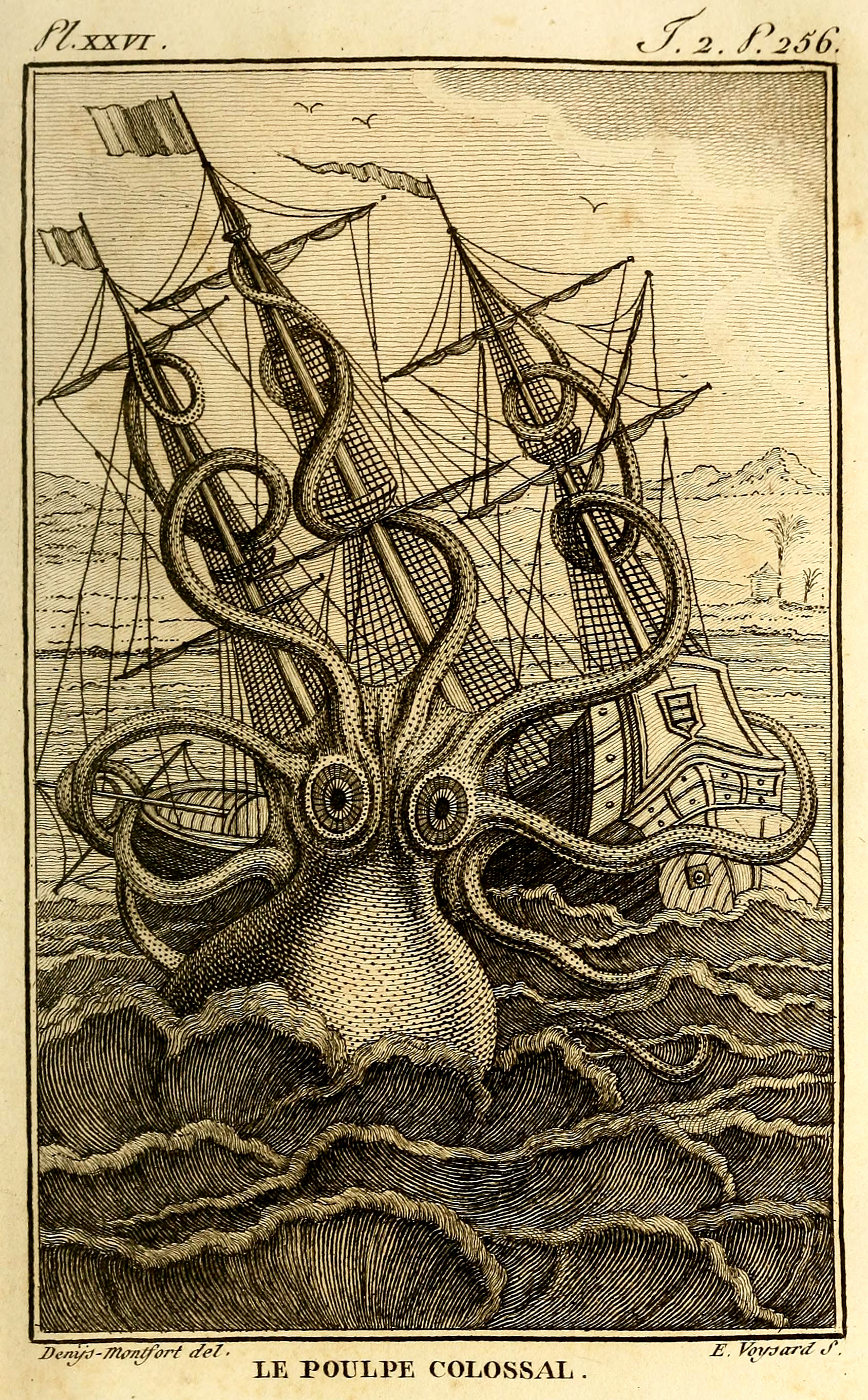 This illustration of a Kraken attacking a ship is by the French naturalist Pierre Dénys de Montfort. He studied the existence of gigantic octopuses after being inspired by a description from 1783 of an eight-metre-long tentacle found in the mouth of a sperm whale.